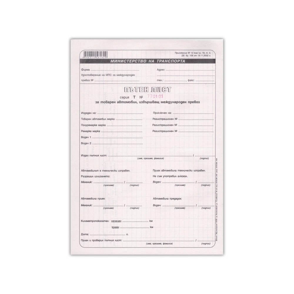 Пътен лист за международен автомобил, 100 листа