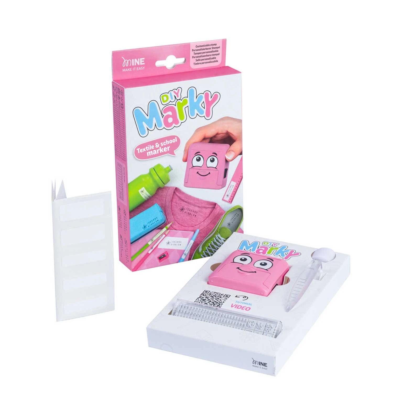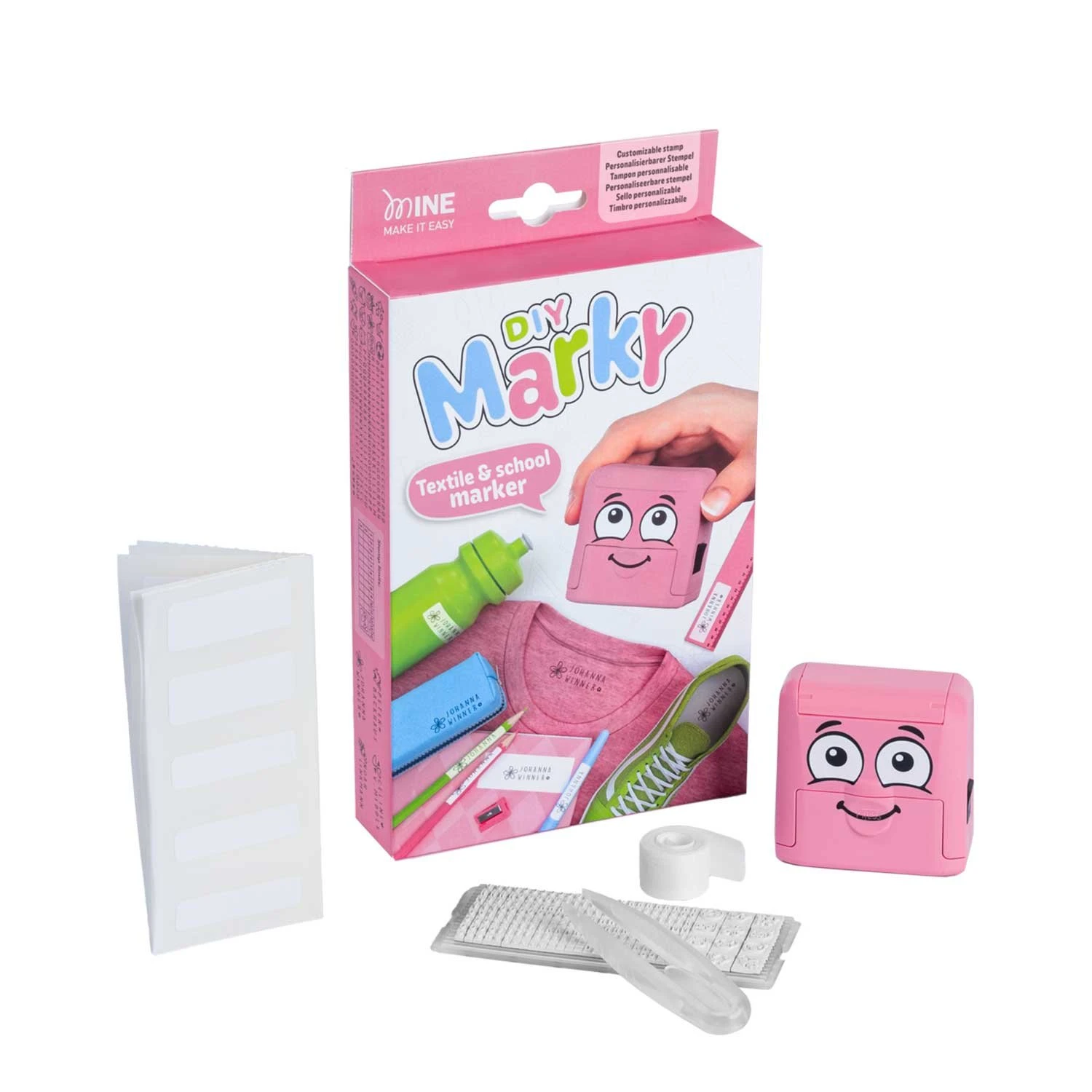 Комплектът съдържа: печат MARKY, 1 m текстилна лента за лепене с ютия, 20 етикета, пинсета, букви на кирилица и символи.