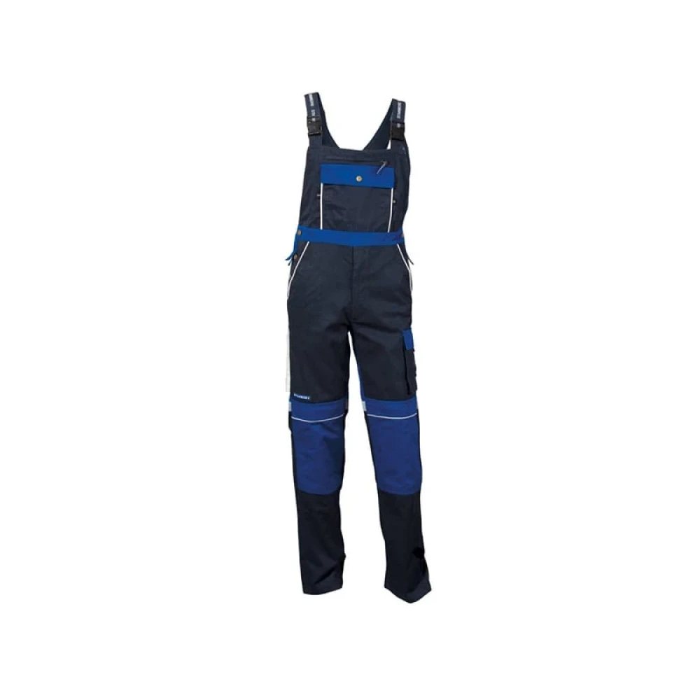 Работен полугащеризон с функционални джобове, подсилени колена с джоб за наколенки и регулируеми презрамки.