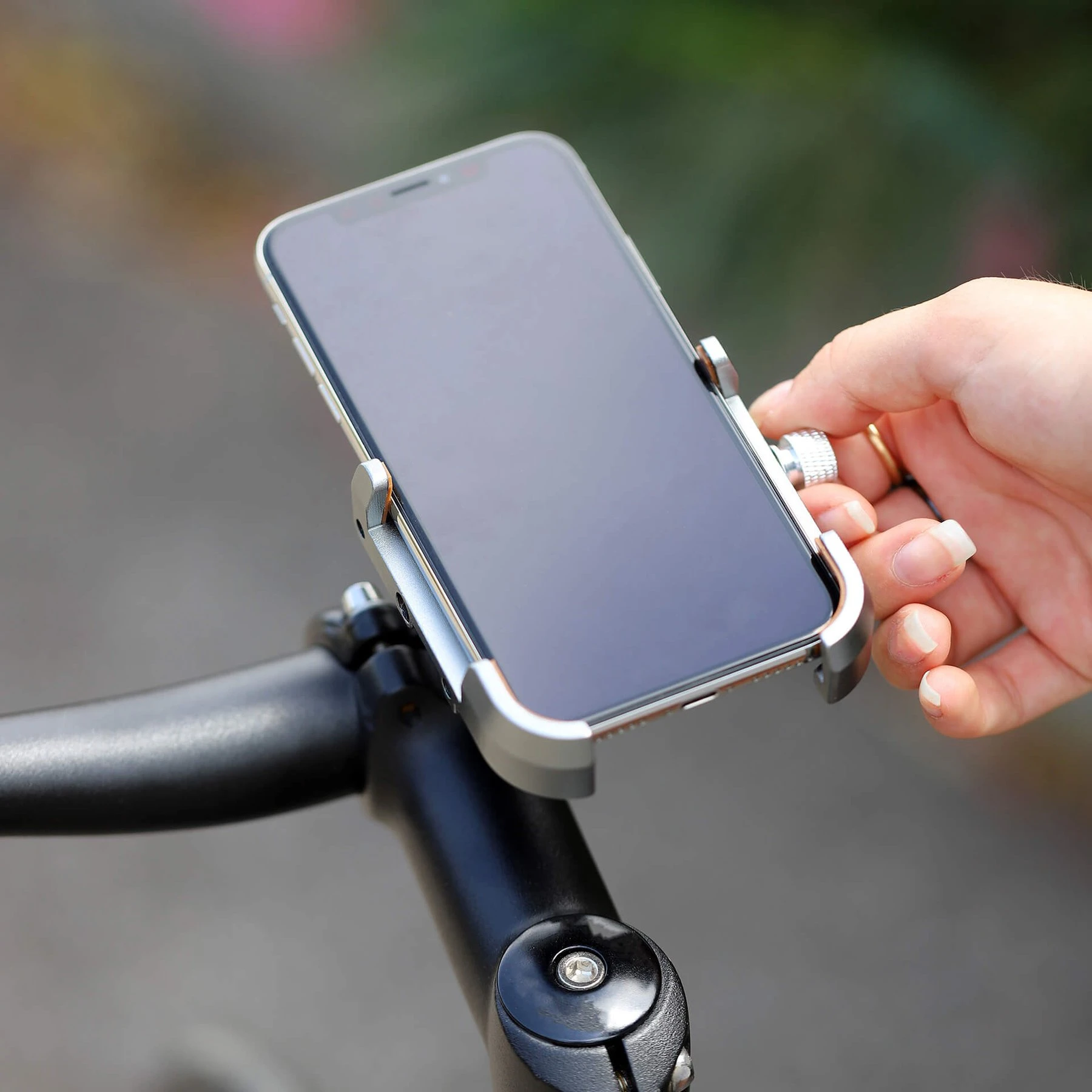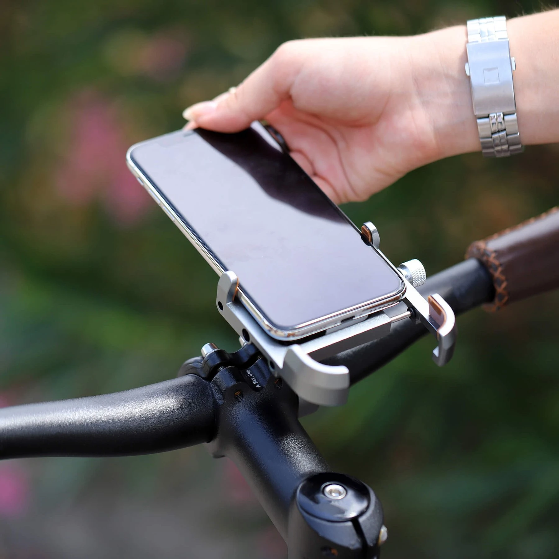 Тази универсална стойка се адаптира към всички смартфони с широчина от 55 до 105 mm. Съвместима с всички дръжки на велосипед с диаметър от 22.2 до 32 mm, тя се закрепва много лесно: имате нужда само от шестостенен ключ (включен в комплекта), за да я завинтите към кормилото.