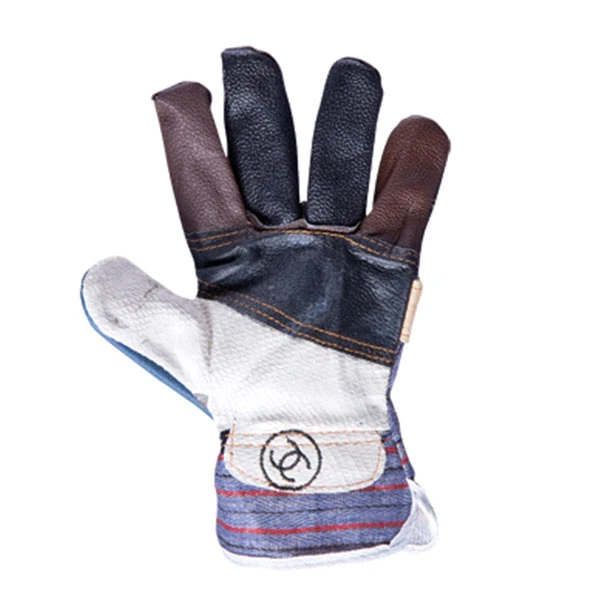 Работни ръкавици, изработени от лицева разноцветна телешка кожа и плат, с подсилена длан.