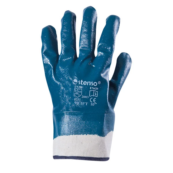 Работни ръкавици с марката SAFETECH, изработени от безшевно плетено трико, изцяло топени в нитрил, с маншет от брезент, маслоустойчиви.