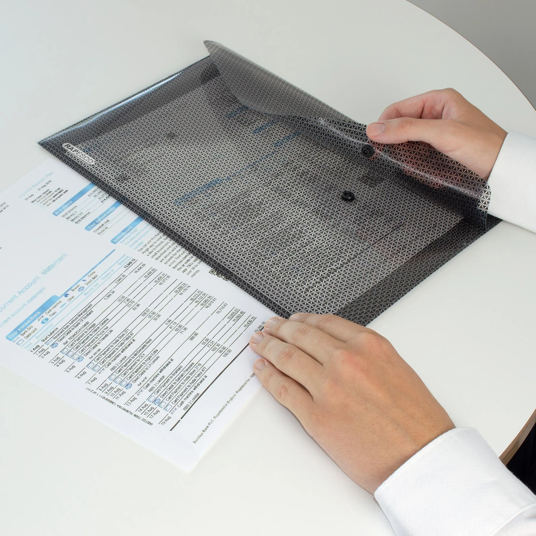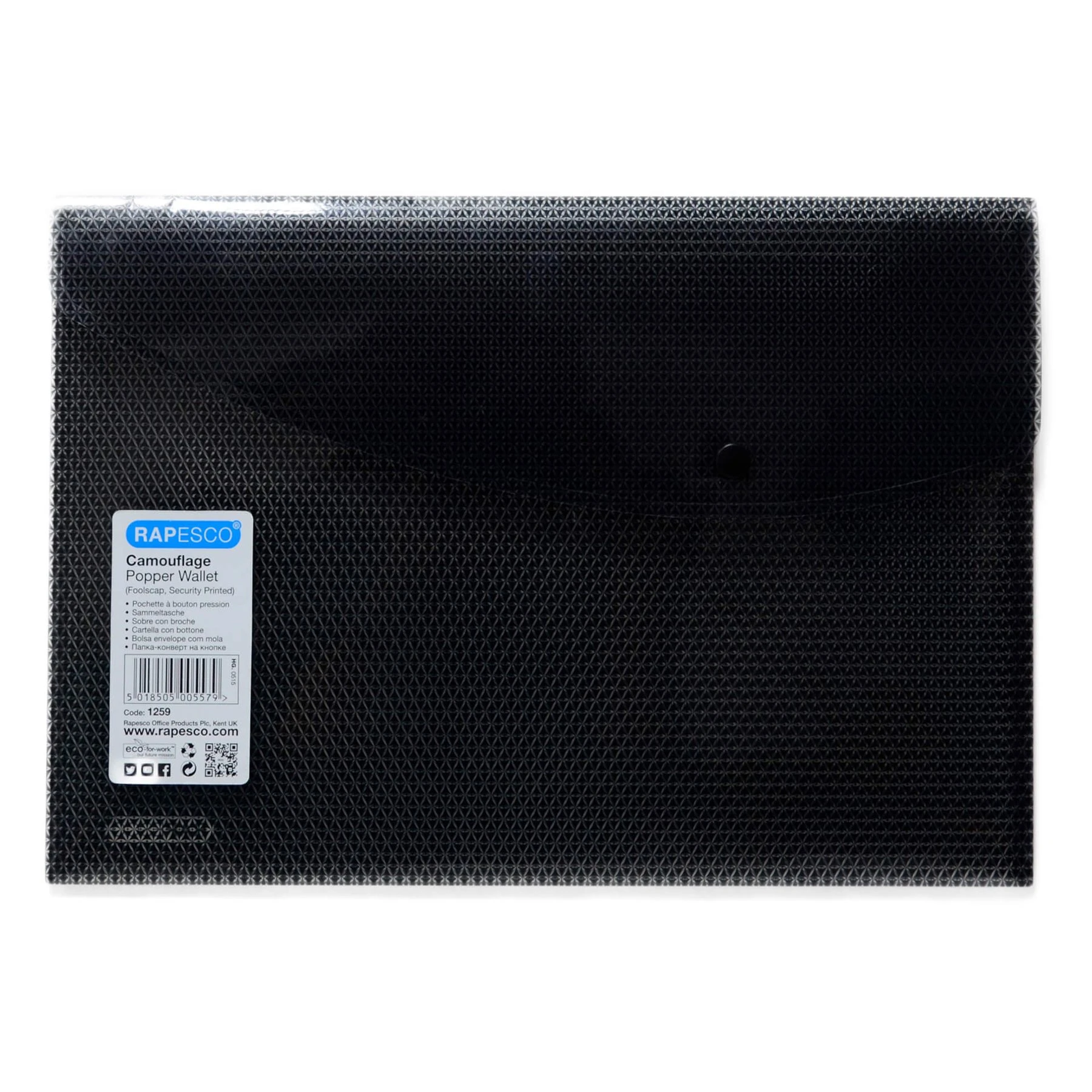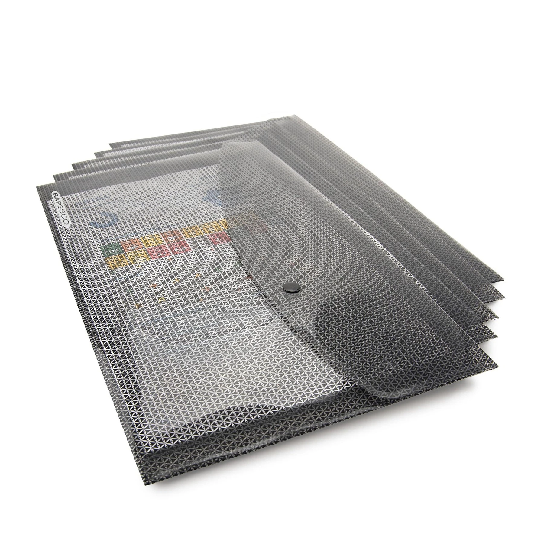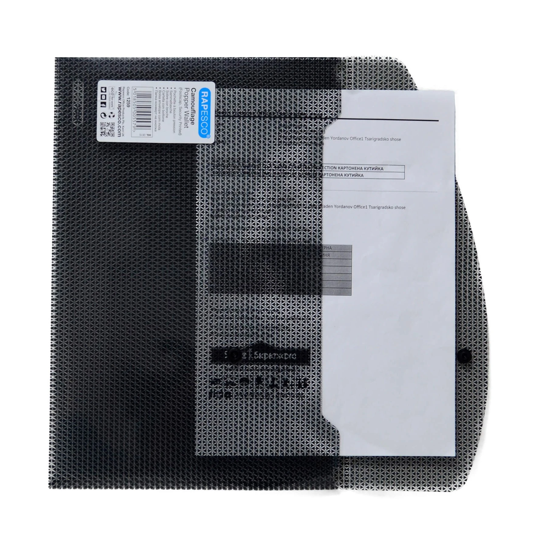 Защитете вашата лична и поверителна информация с уникалната папка Camouflage от Rapesco. Специалният камуфлаж принт прави невъзможни за разчитане поставените документи, въпреки че на пръв поглед папката е прозрачна. Текстовете с голям шрифт остават четливи с цел по-лесно разпознаване на съдържанието.