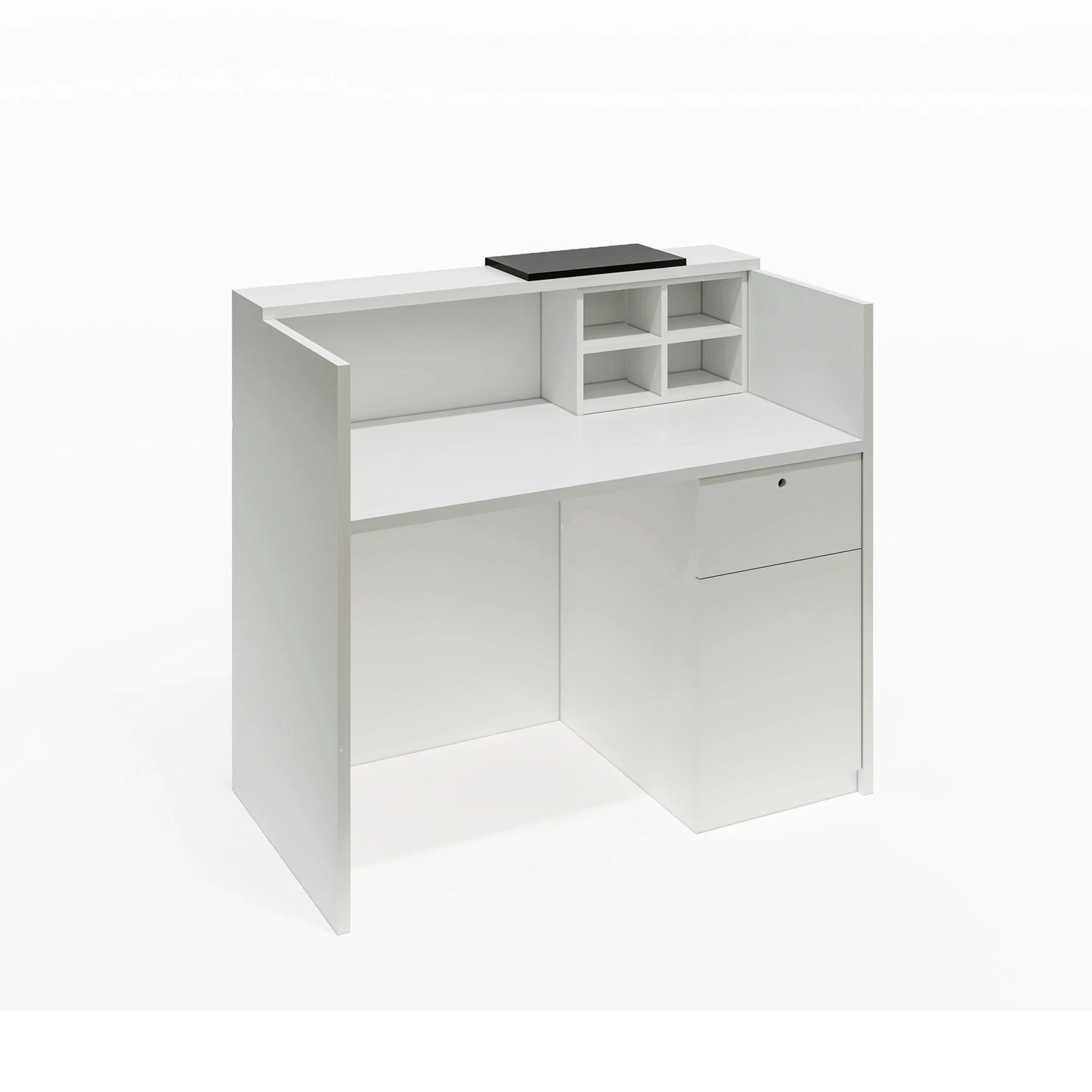 Има заключващи се чекмеджета за съхранение на лични вещи и важни документи и отворени рафтове за допълнителна функционалност.