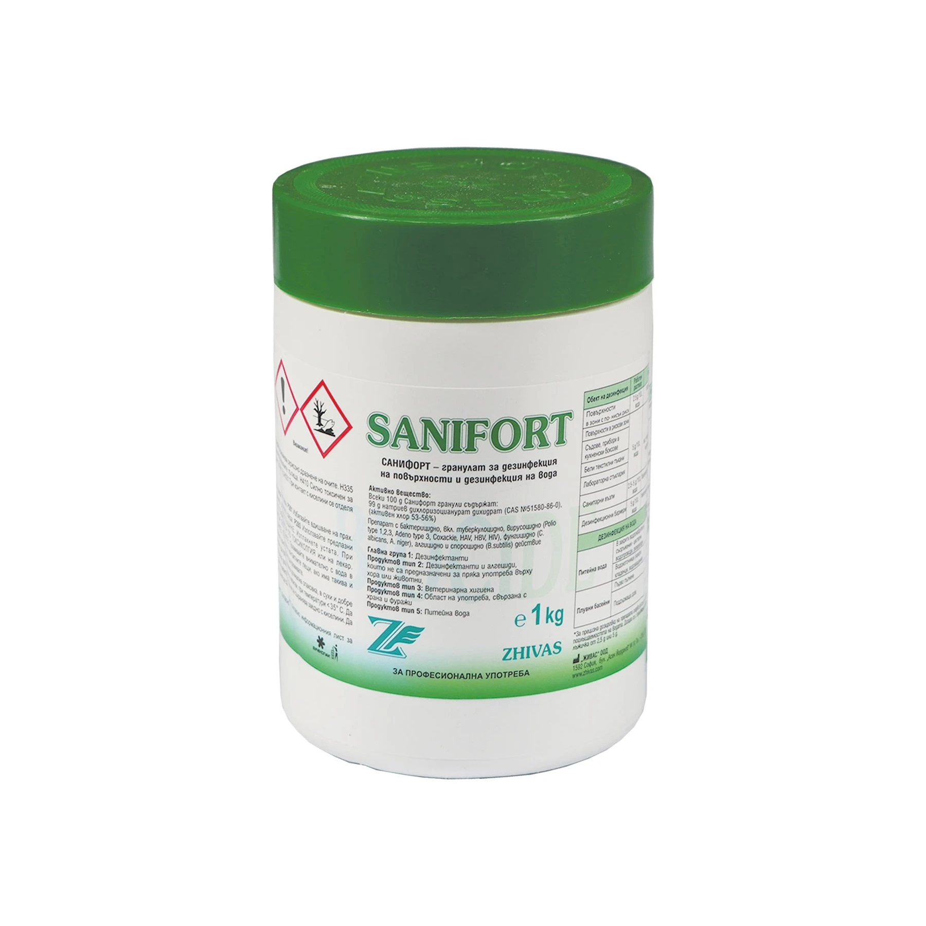 Намира широко приложение за дезинфекция на всякакви водоустойчиви повърхности. Представлява изключително ефективен при много ниски концентрации препарат с бактерицидно, микобактерицидно (вкл. туберкулоцидно), фунгицидно, алгицидно, вирусоцидно и спороцидно действие. Широкоспектърен високоефективен концентриран препарат на базата на натриев дихлоризоцианурат дихидрат във формата на гранули и таблети.