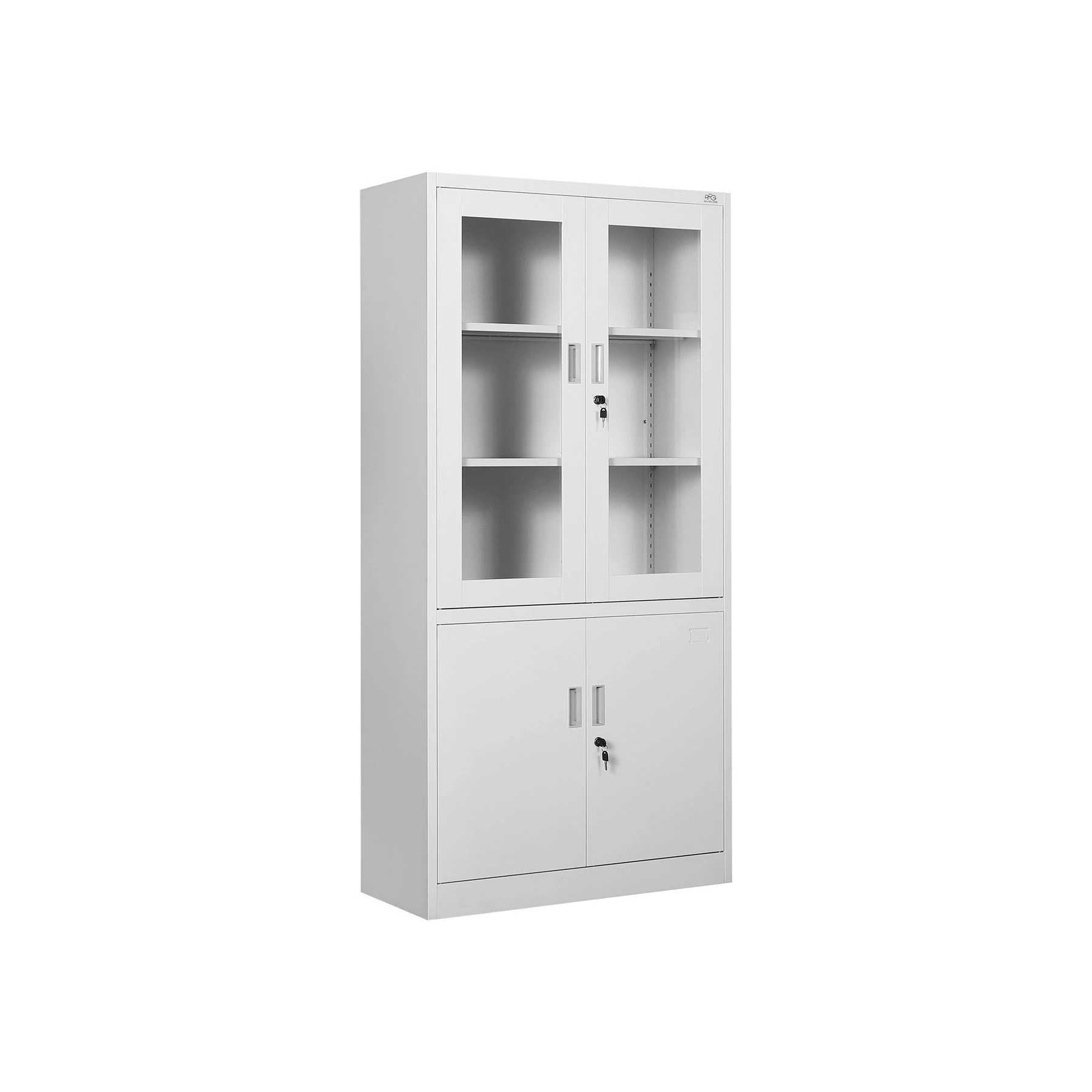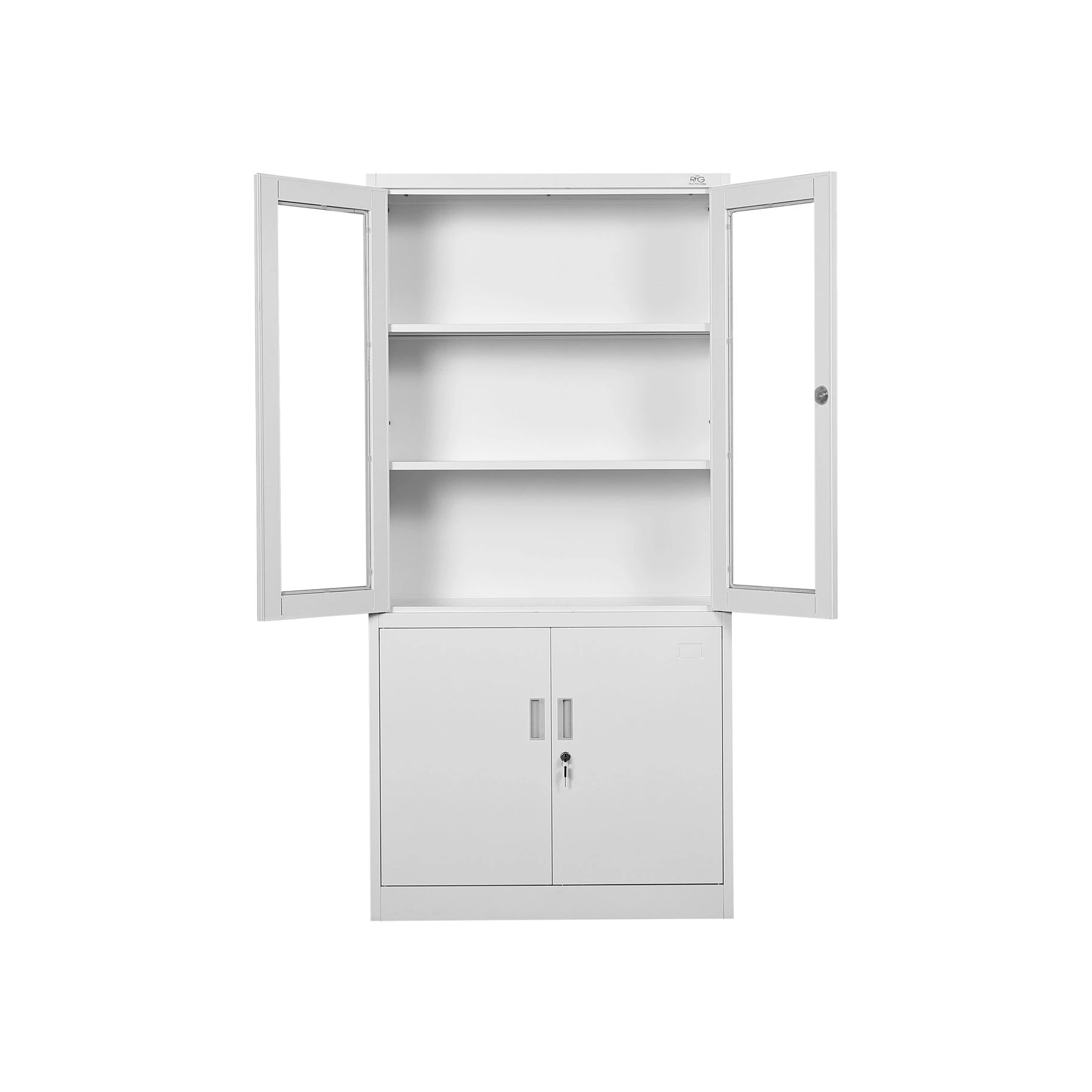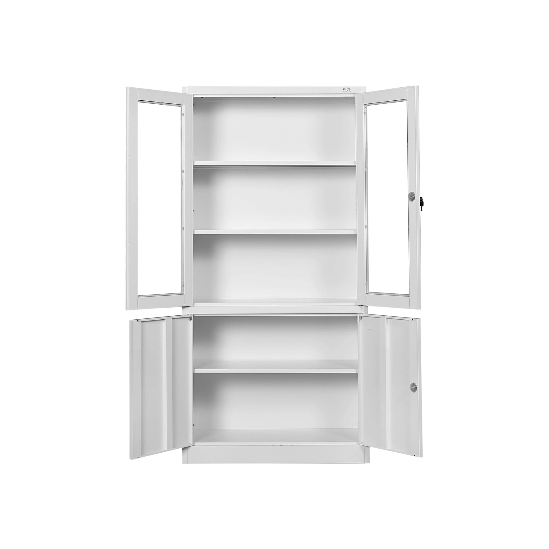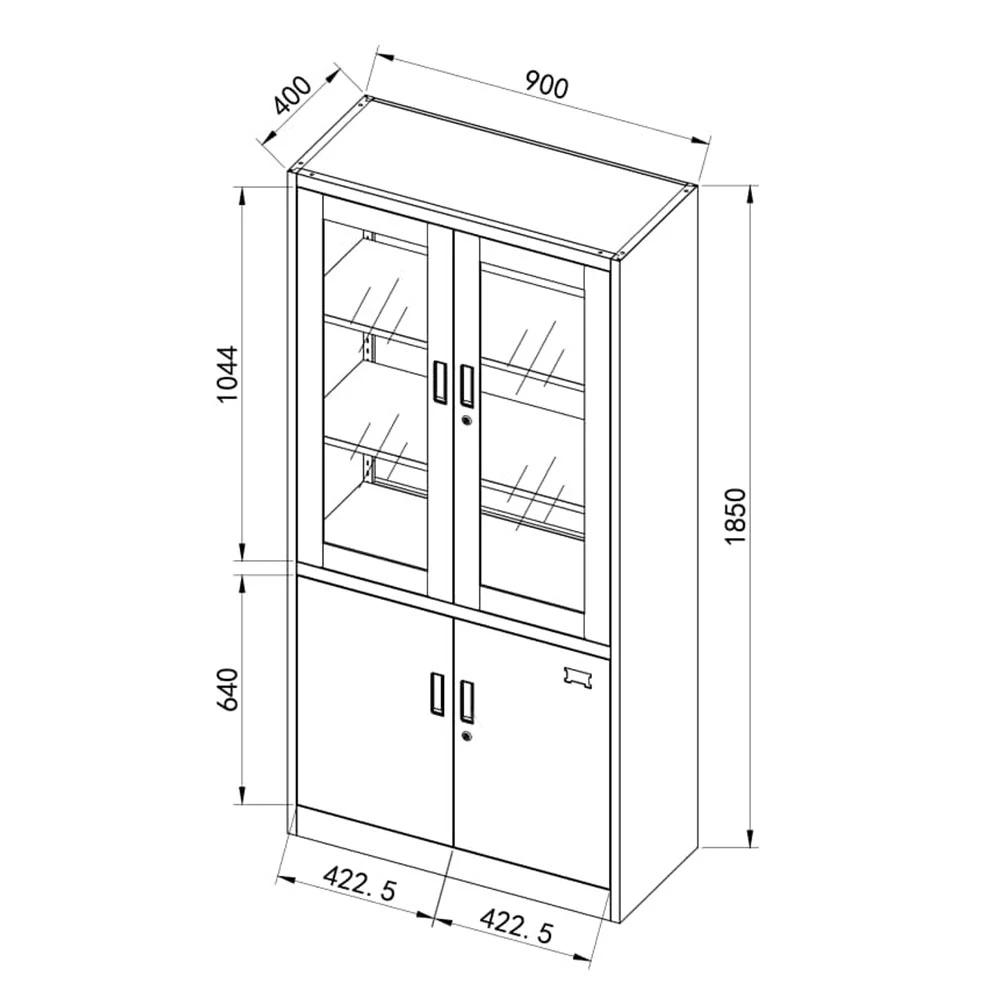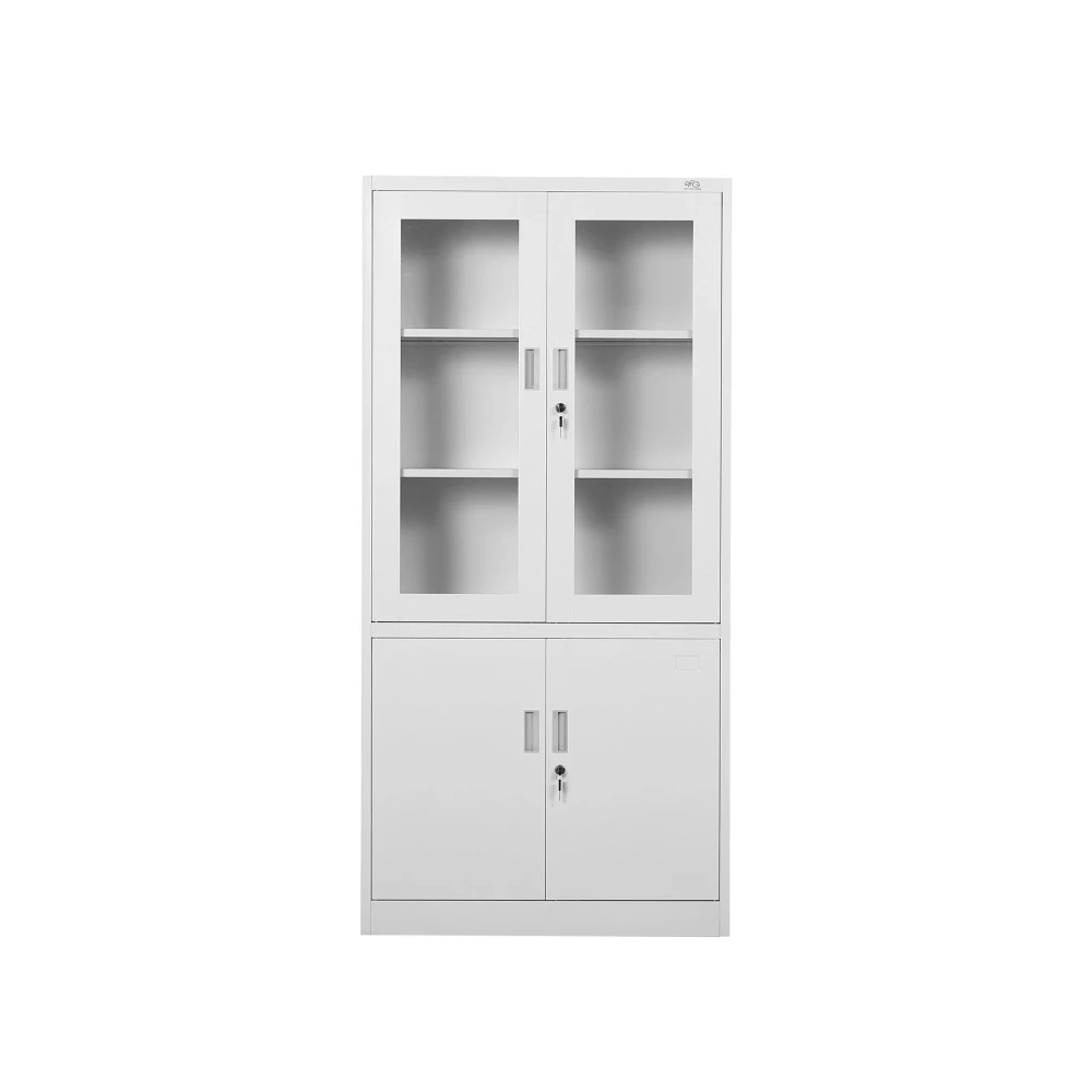 Метален шкаф с две стъклени и две метални врати.