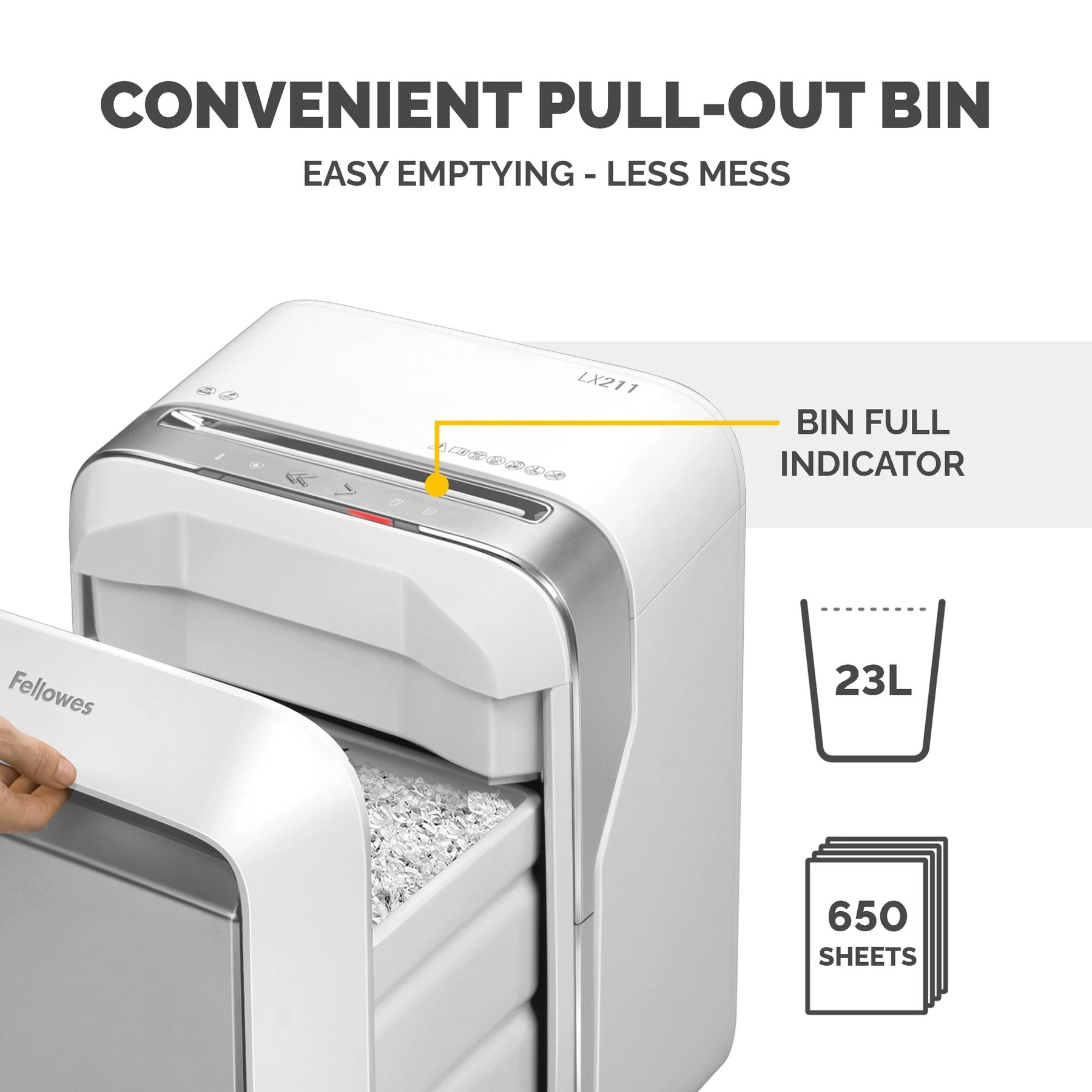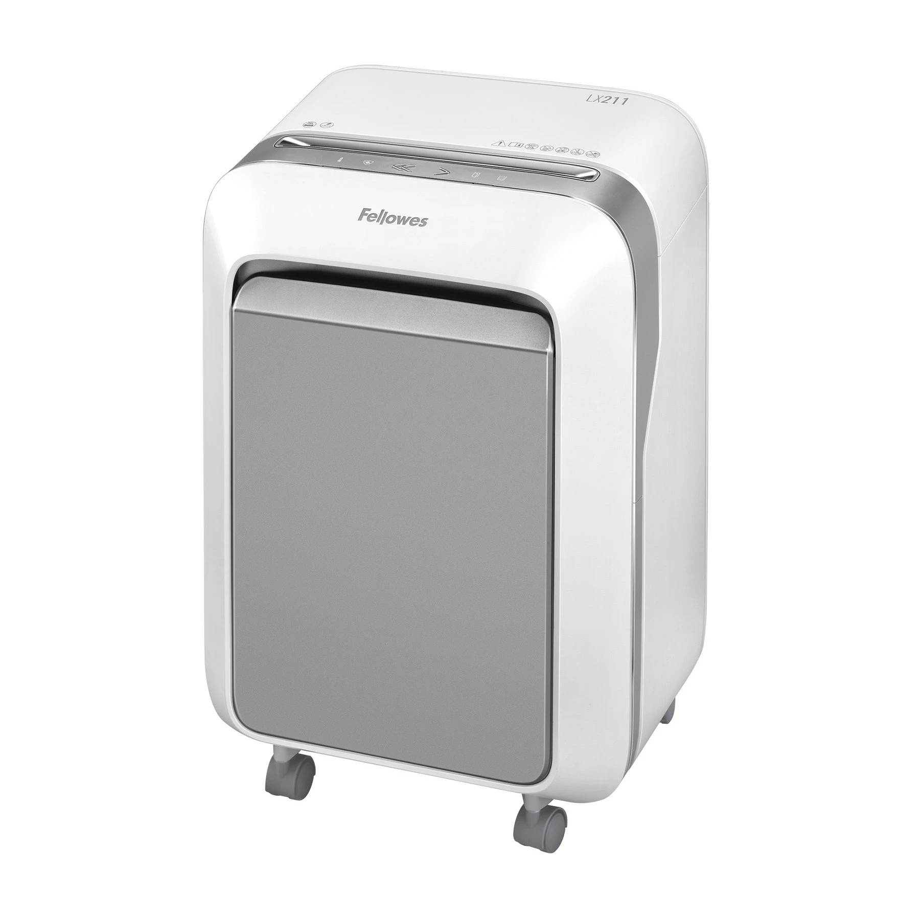 Шредер за унищожаване на документи Fellowes LX211, Micro-Cut, 23 L, бял, P-5, за 1-3 потребителя