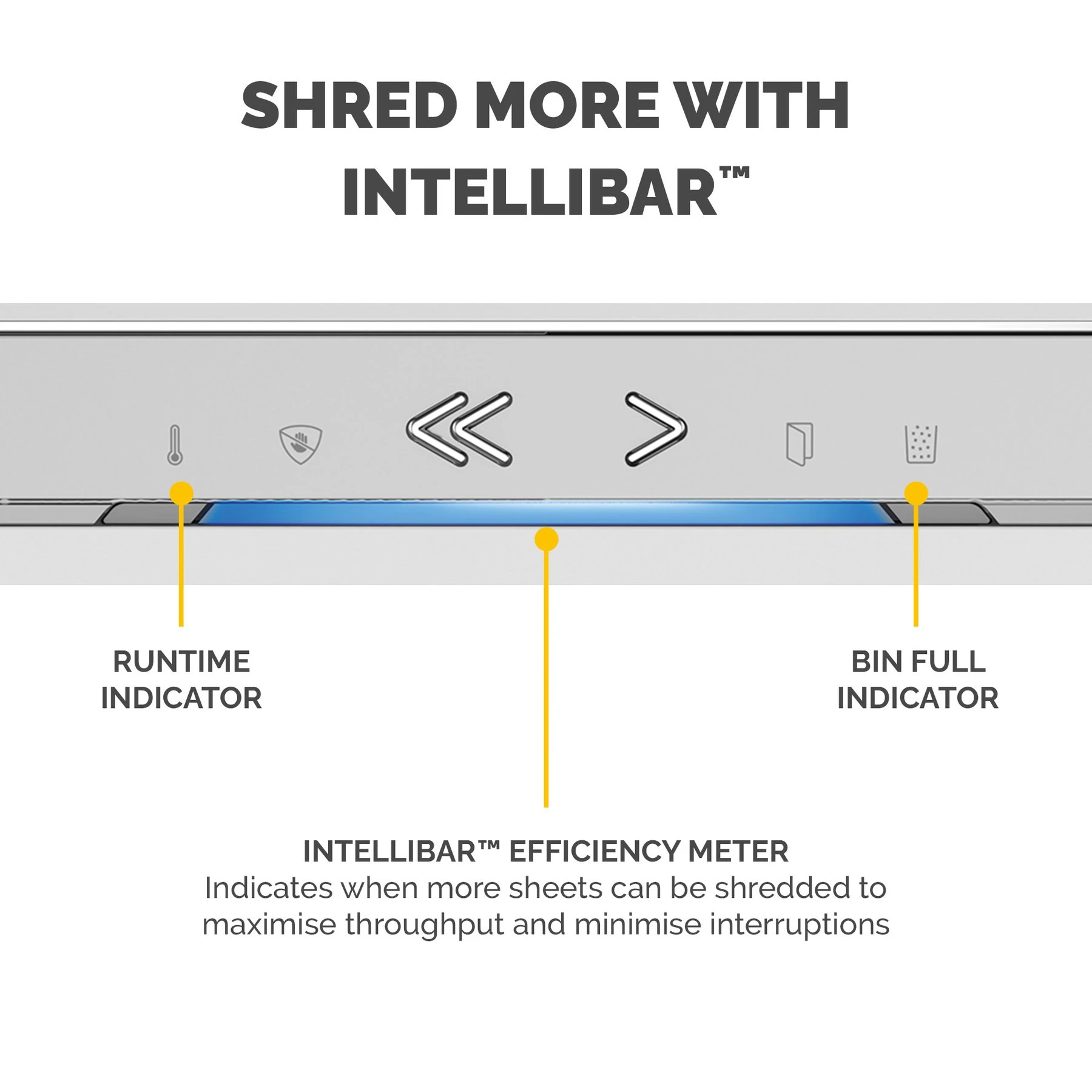 Intellibar™ технологията увеличава максимално произведителността на шредера – предотвратява прекъсванията на работния процес, като предварително сигнализира за запълването капацитета на коша и показва оставащото време на изпълнение.