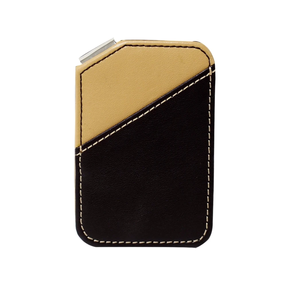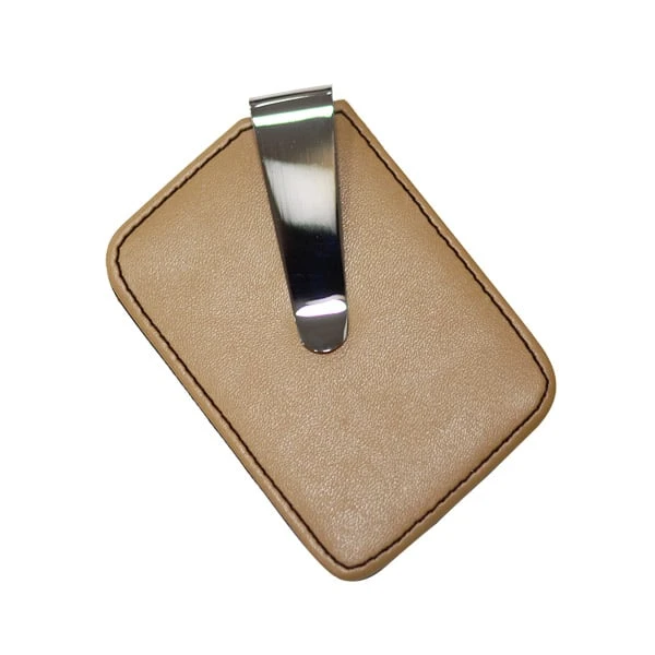 Щипка за пари и карти с калъф. Комбинация от метал и светлокафява кожа.
