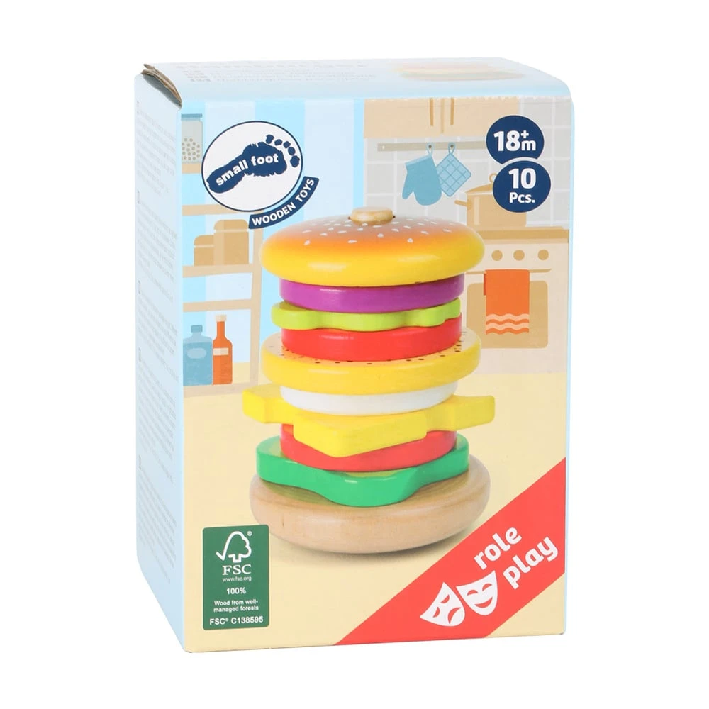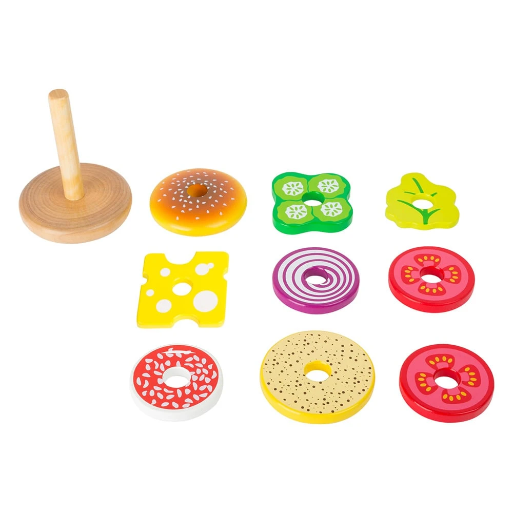 Вкусен бургер за подреждане! Може да гарнирате бургера с различни съставки, а със заобленото дъно може да постигнете ефекта на клатеща се кула. Играта насърчава развитието на двигателните умения и въображението.