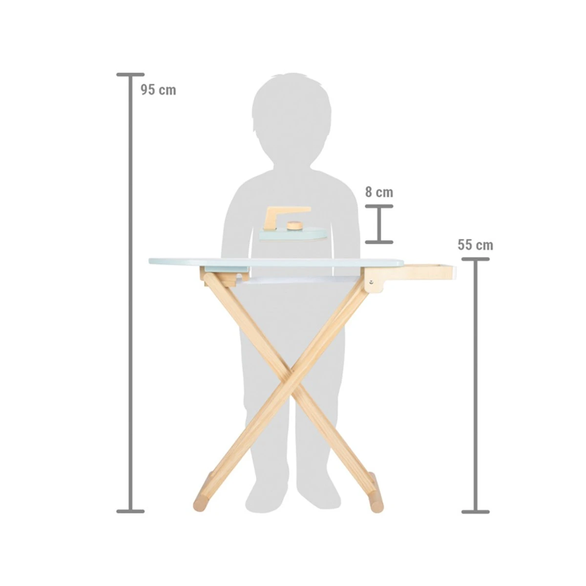 Дъската за гладене има две различни настройки на височина, позволявайки персонализиране според височината на детето.
