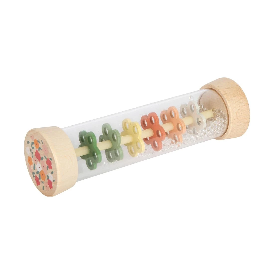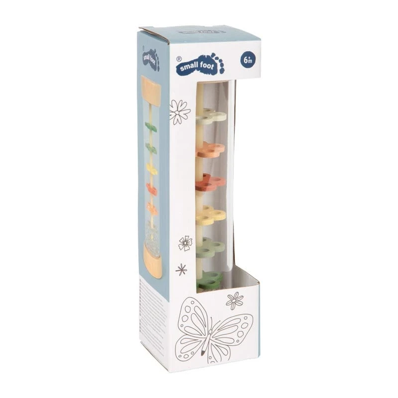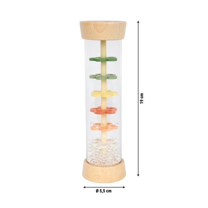 Little Friends внася магията на дъждовните капки директно в детската стая – визуално и акустично! Малките топчета вътре в пръчката за дъжд създават приятно, нежно потракване, напомнящо падащ дъжд, докато се стичат през шест цветни перфорирани пластини във формата на цветя.