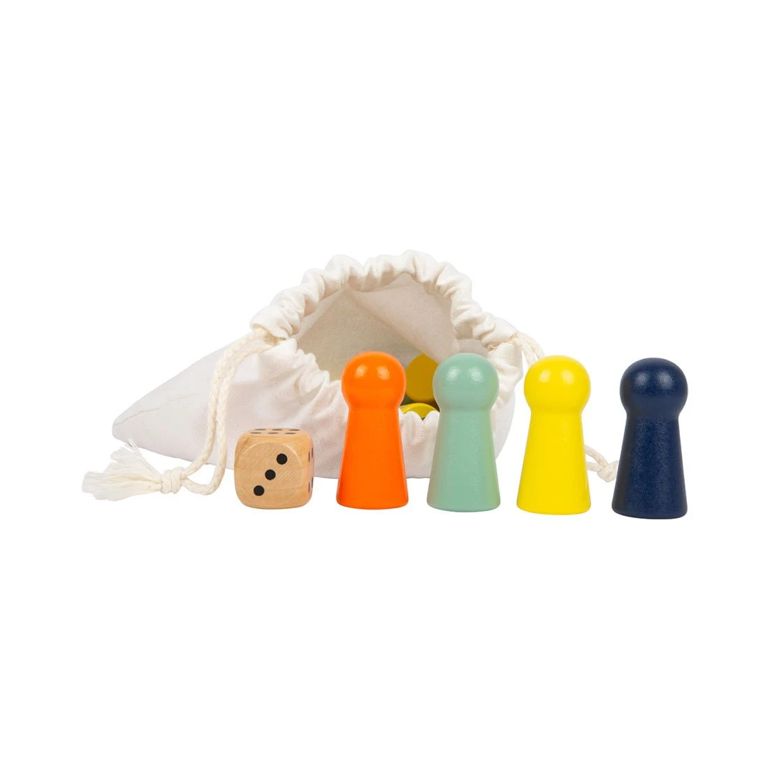 Комплектът съдържа игрално поле, зарче, 16 игрални фигури в оранжево, жълто, синьо и ментовозелено и текстилна торбичка.