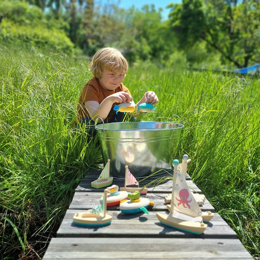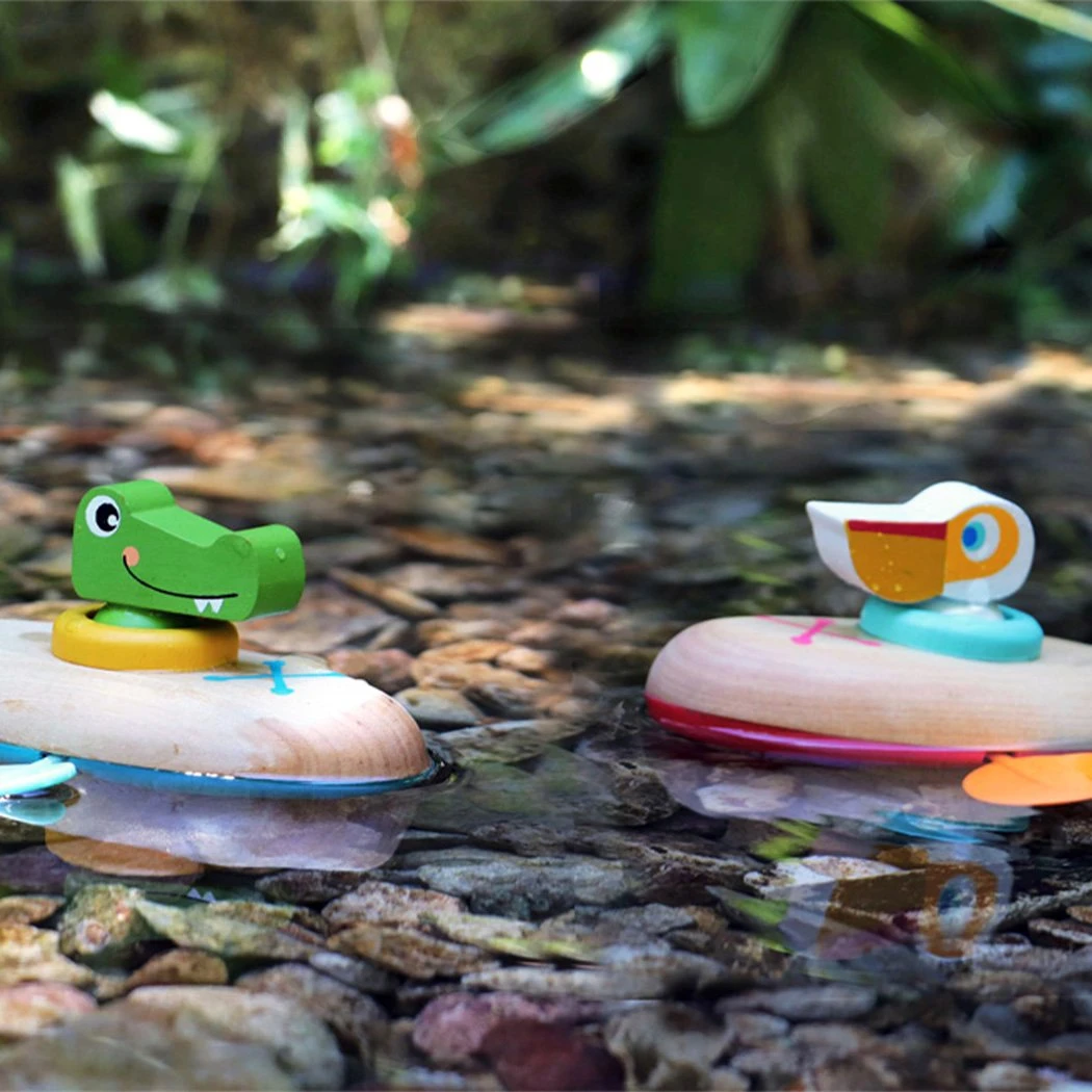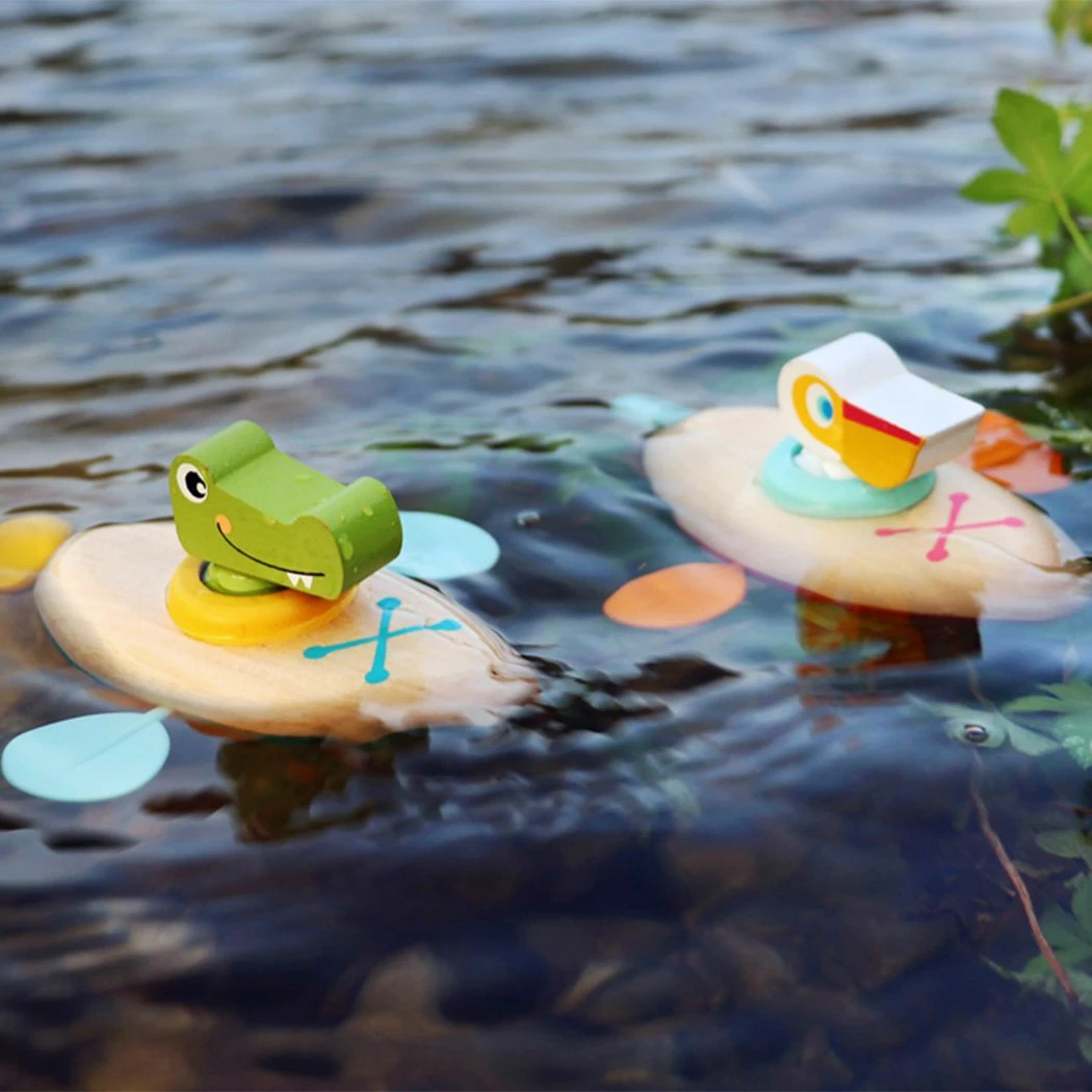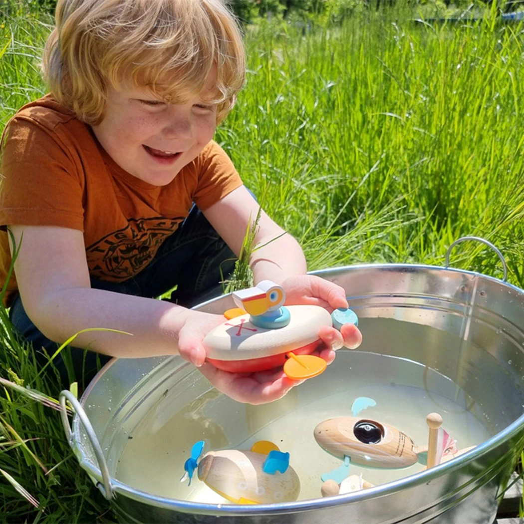 Този сладък пеликан и неговото дървено и пластмасово кану ще осигурят страхотно забавление при къпане, когато той пътува сам във водата.