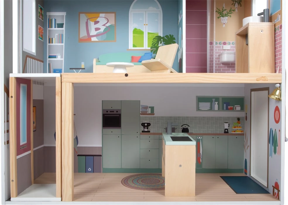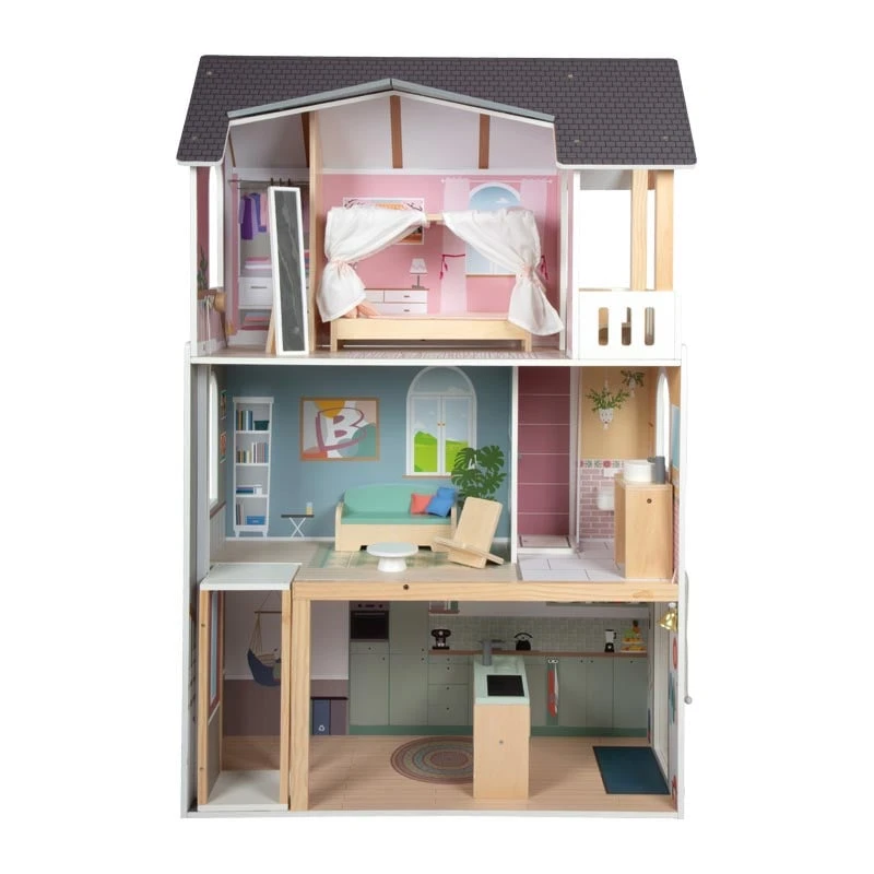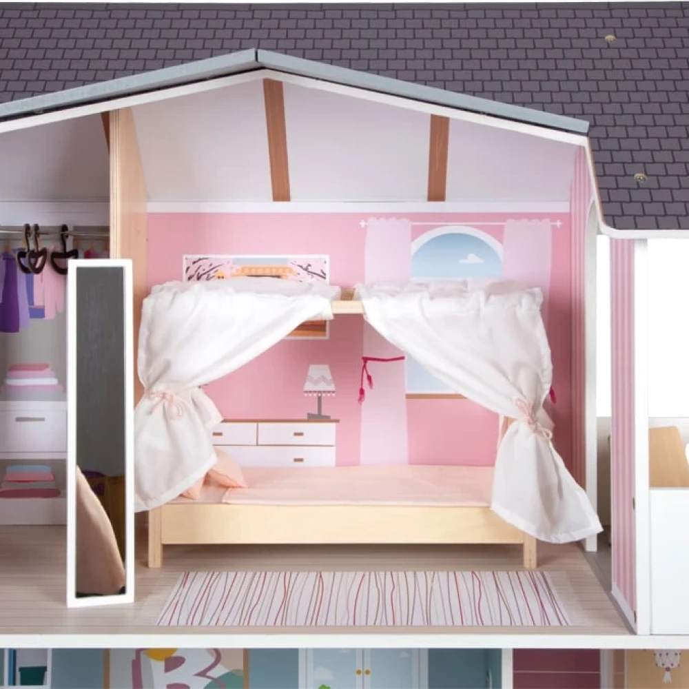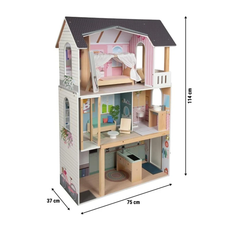 Луксозна триетажна куклена вила (в мащаб 1:6) с балкон и асансьор с манивела. От балдахиново легло и гардероб до модерна баня с плексигласова душ стена, комплектът идва с елегантни мебели за потапяща се игра, богата на истории.