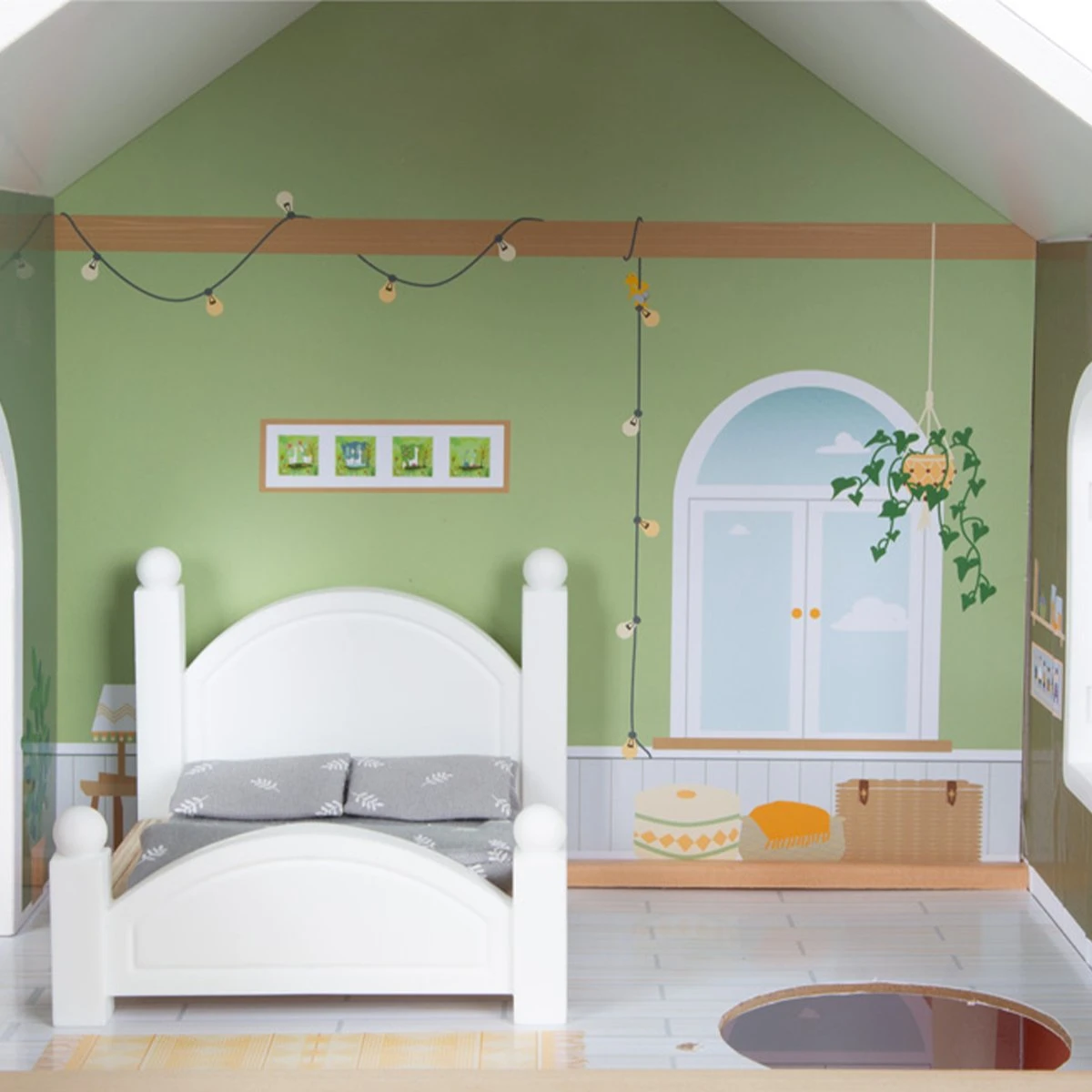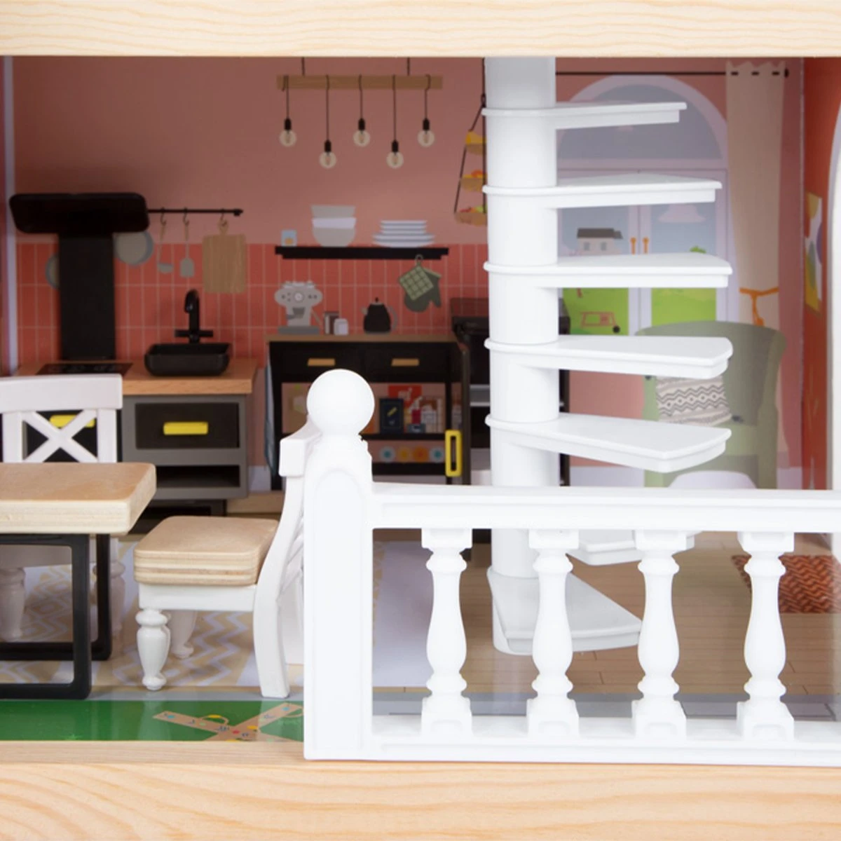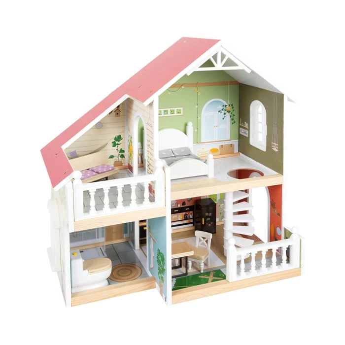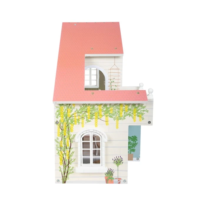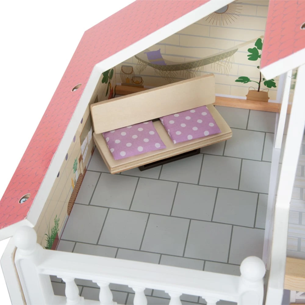 Тази къща за кукли се вписва чудесно във всяка всекидневна или детска стая, благодарение на светлата си външна фасада и модерна цветова схема.