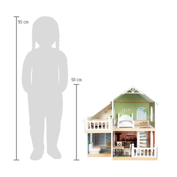 Акцентите на тази къща за кукли са голямата тераса на покрива със седалки и парапети, тоалетната с отваряем капак на седалката и кухненски шкафове и хладилник с врати и чекмеджета за особено реалистично изживяване при игра.