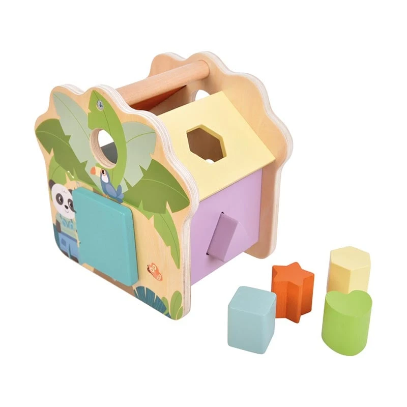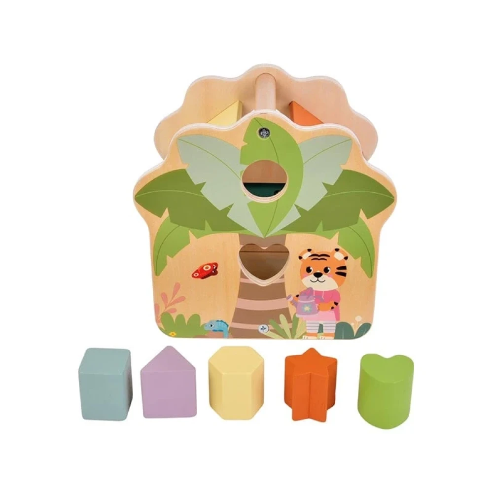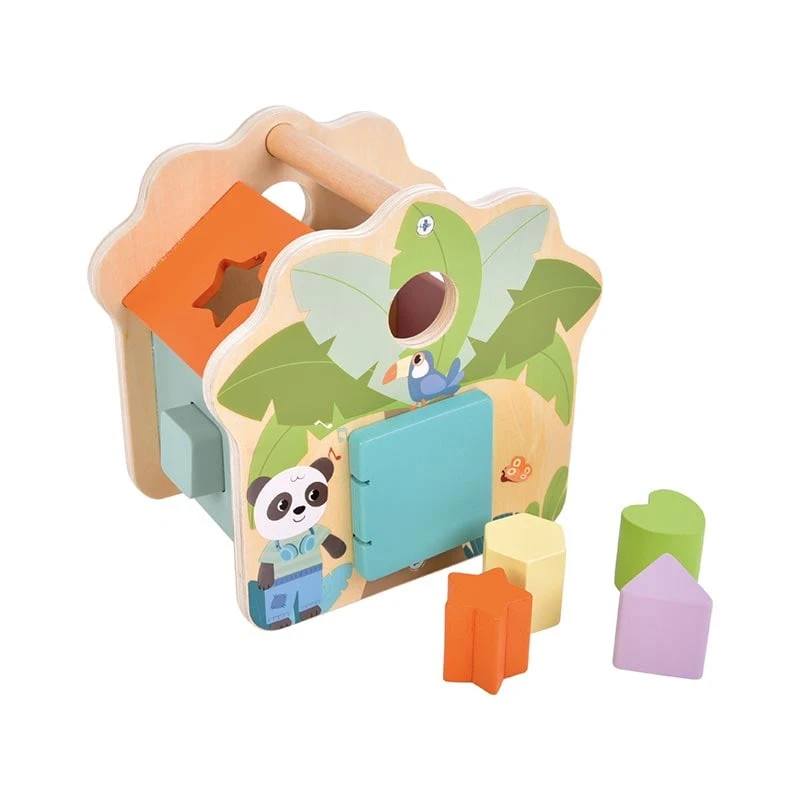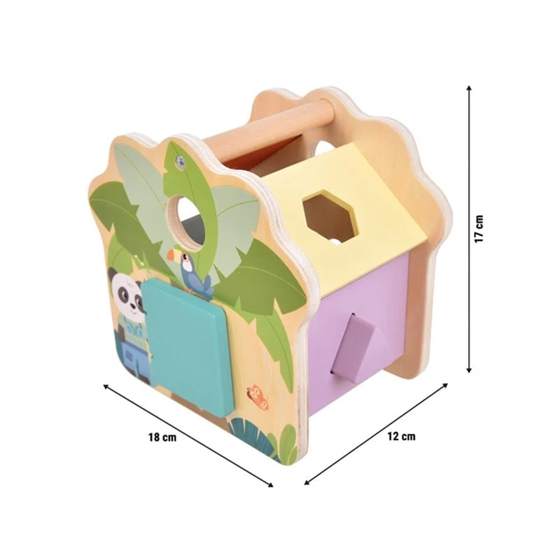 Тази къща с детски, приятелски дизайн и нежни илюстрации, както и пет хармонично подбрани дървени блокчета, прави прекрасно впечатление. Отворите отстрани насърчават съчетаването и сортирането.