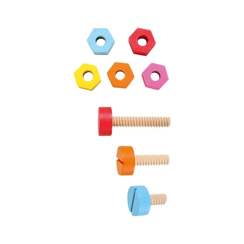Включва линийка, отвертка, чук, гаечен ключ, три винта и пет гайки от масивно дърво с цветно лакиране.