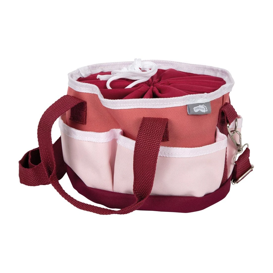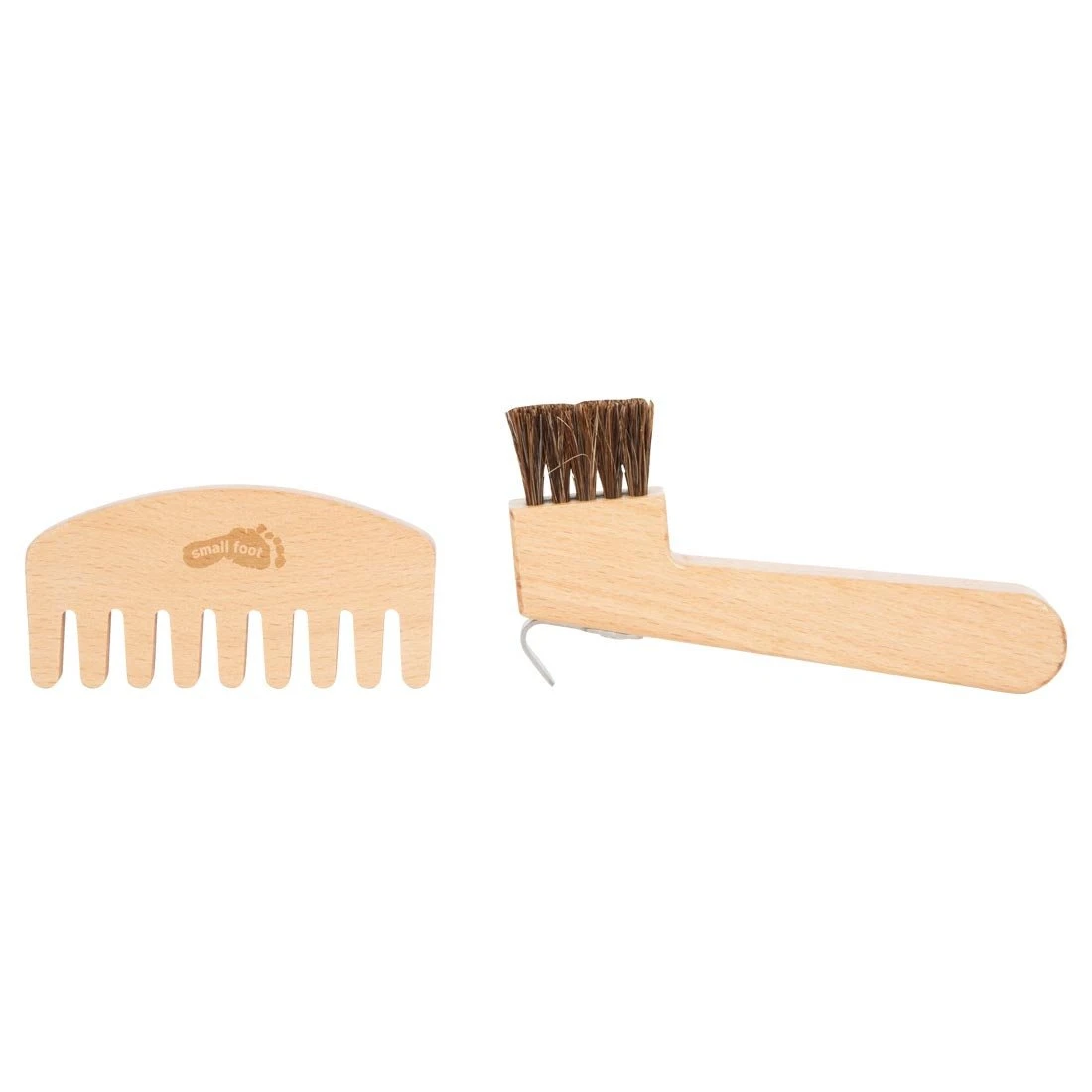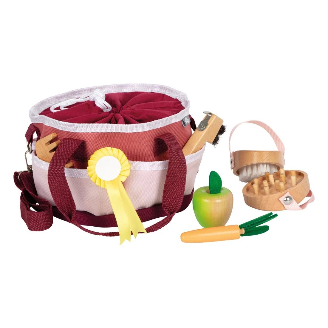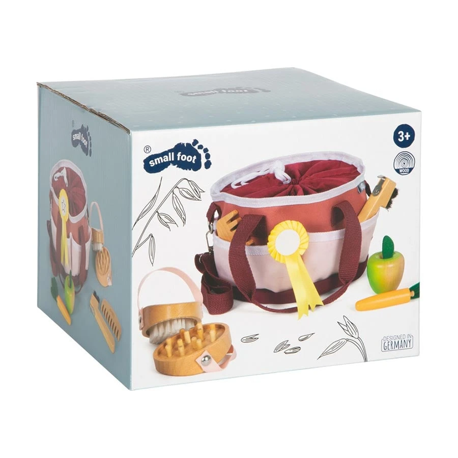Всичко необходимо за грижа за играчки-кончета: детски комплект за поддръжка на коне в практична текстилна чанта с дръжка & презрамка. Включва дървена четка, гребло за грива, инструмент за почистване на копита с четка, гребен за грива, както и ябълка и морков за въображаемо хранене.