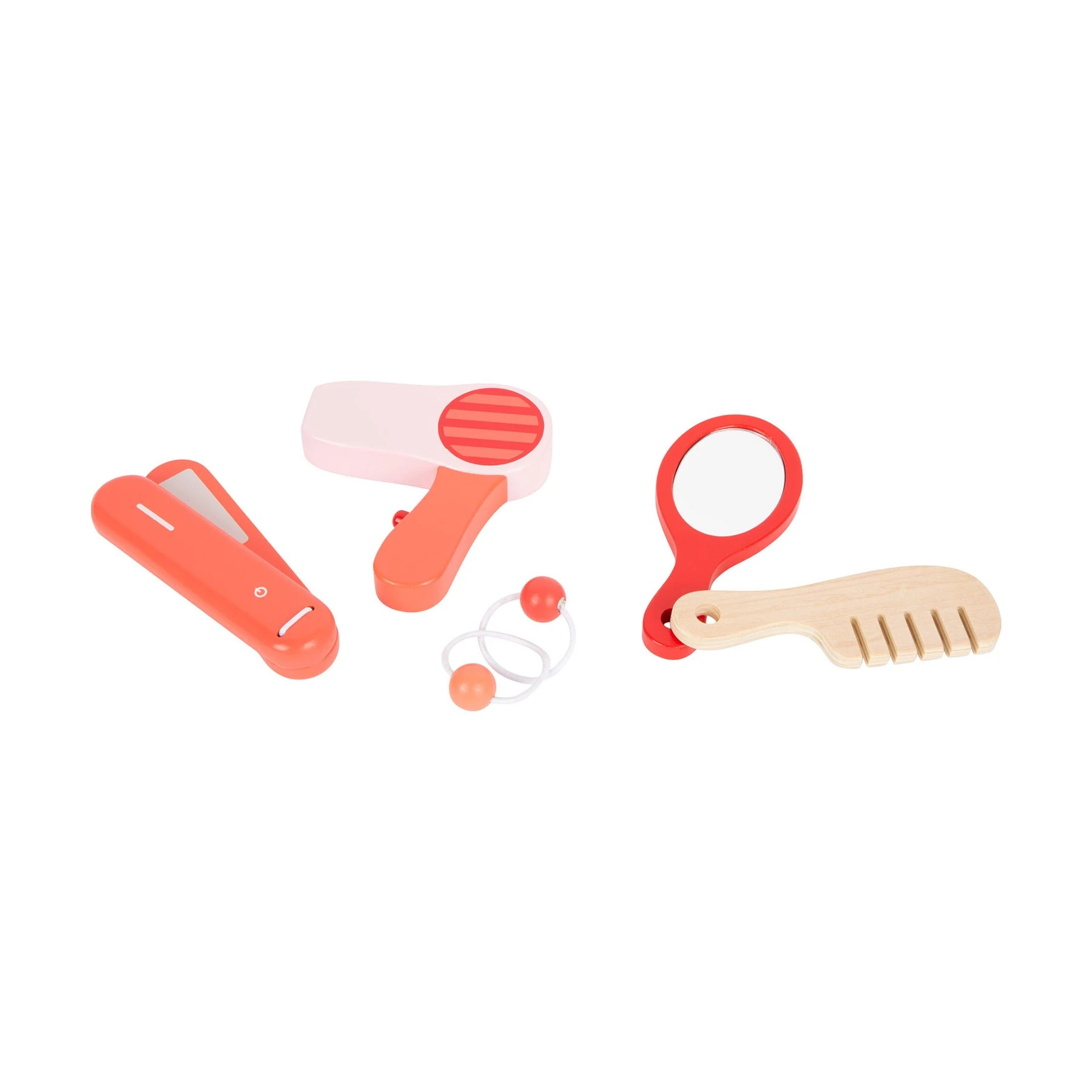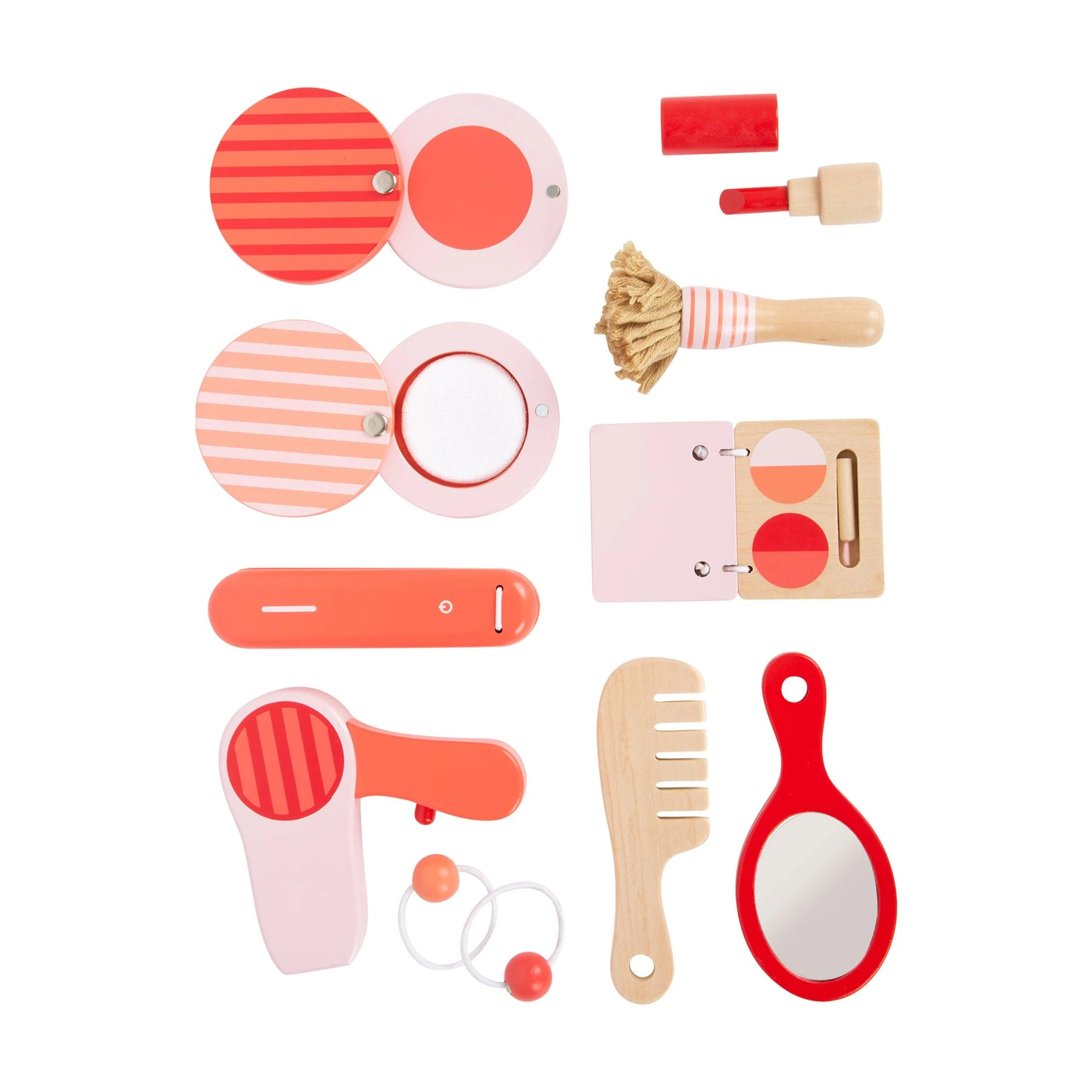 На вниманието на всички гримьори и фризьори! Дървеният комплект се състои от всички необходими аксесоари за гримиране и грижа за косата, като пудра, руж, четка за пудра, червило, огледало, сенки за очи, преса за изправяне на коса, сешоар, гребен и ластици за коса. Резултатът е – стилни и красиви, като мама!