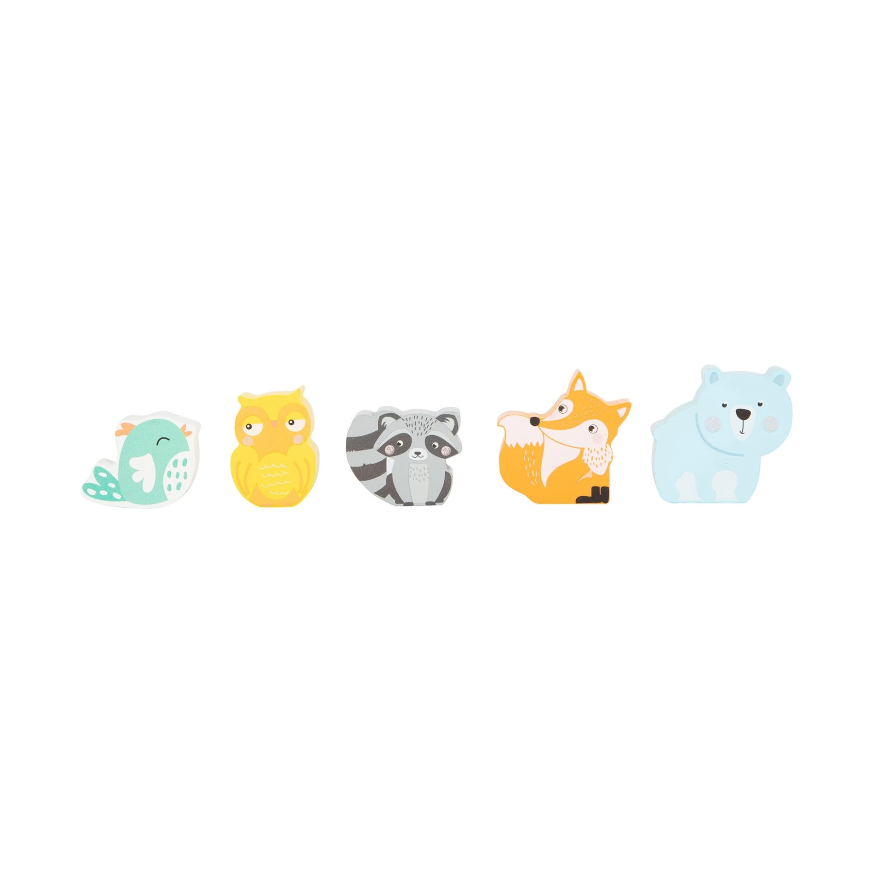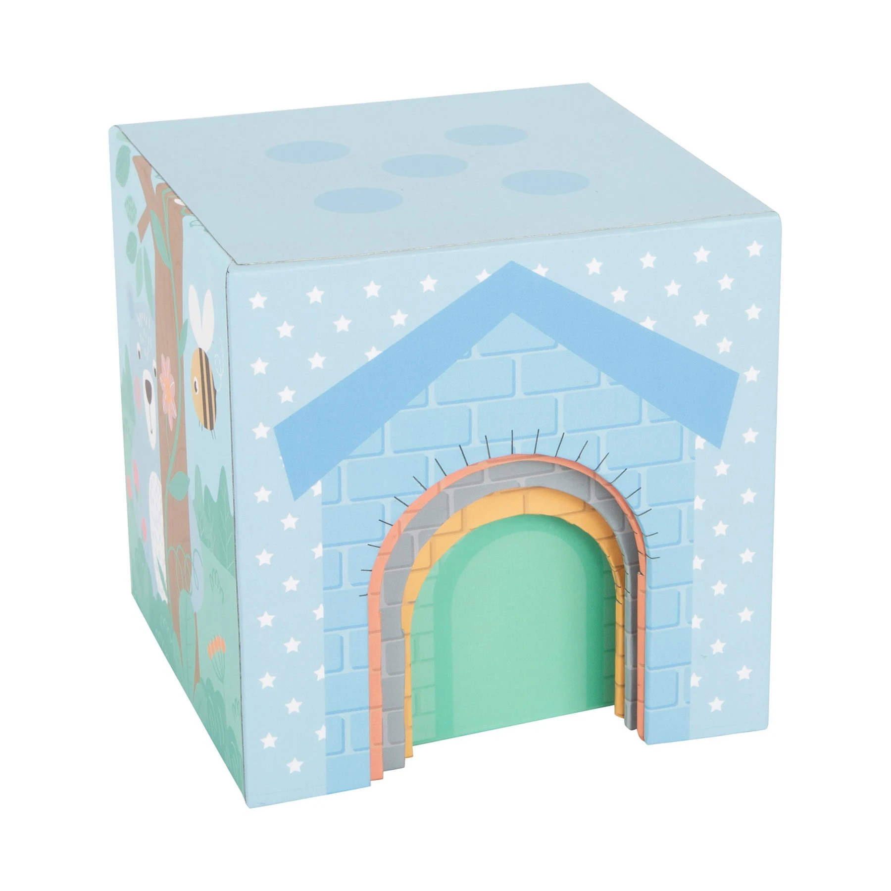 Всичките пет кубчета са в модерни пастелни цветове и илюстрация на животни, които чакат да бъдат подредени. Четири от кубчетата имат отвори за врати и прозорци, за поставяне на фигурките на животни.