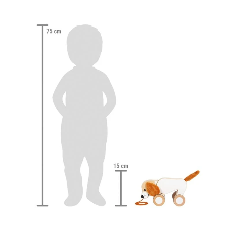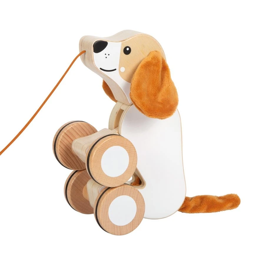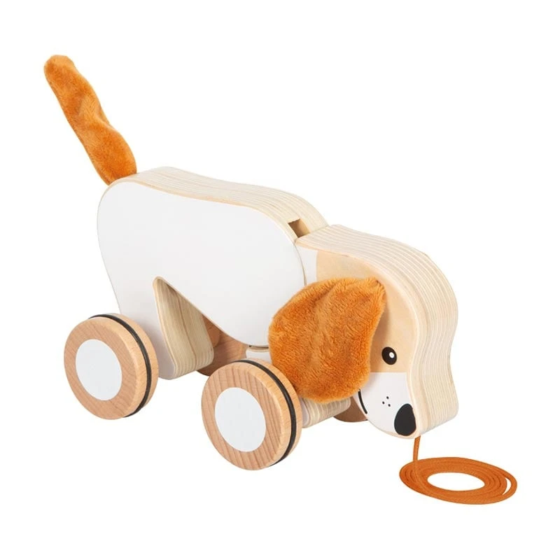 Тази дървена играчка за бутане и дърпане е създадена по принципите на образователните играчки Монтесори, като насърчава активната игра и подпомага естественото развитие на детето. Детето лесно може да дърпа кученцето със здравото въженце, което ще го стимулира да се движи повече и да открива нови пространства.