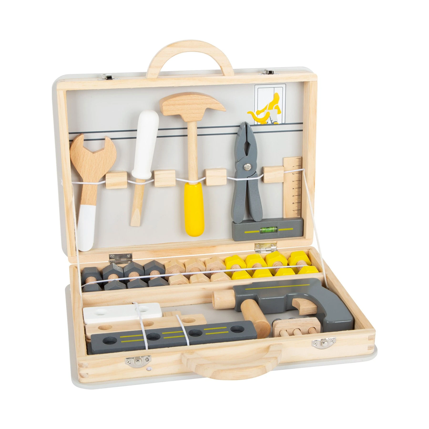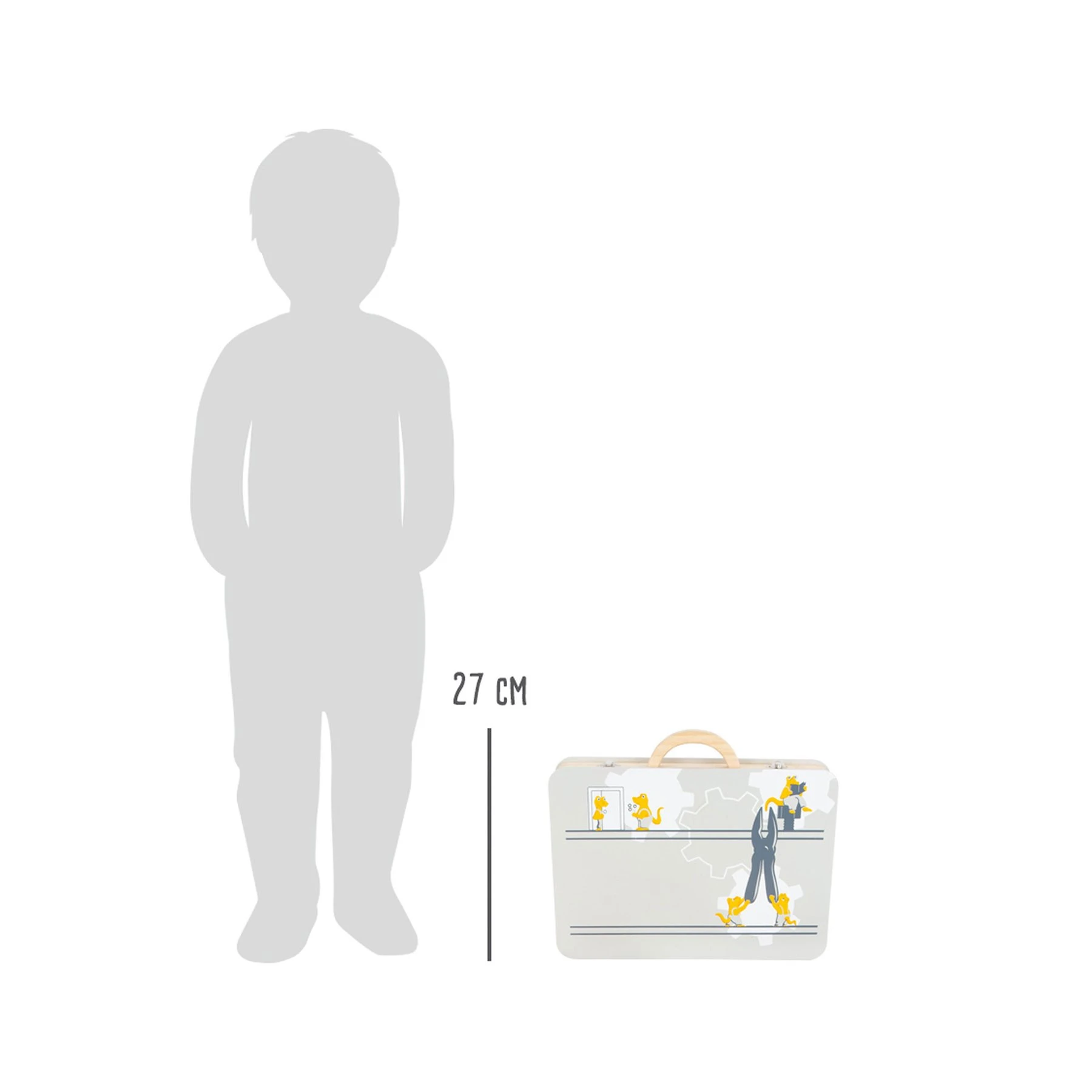 На вниманието на всички малки занаятчии! С дървения куфар с инструменти в класическите цветове на работилницата, децата ще станат едни истински майстори и професионалисти, докато играят.