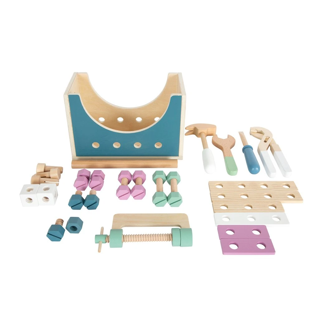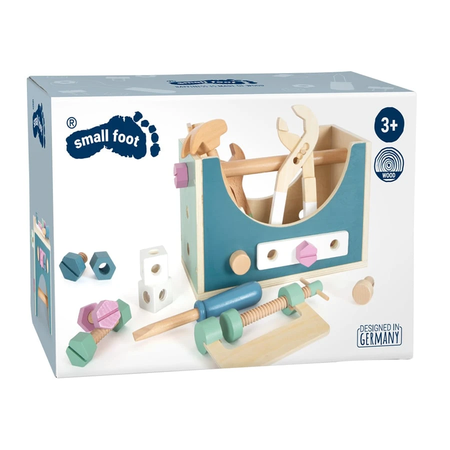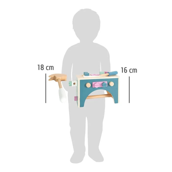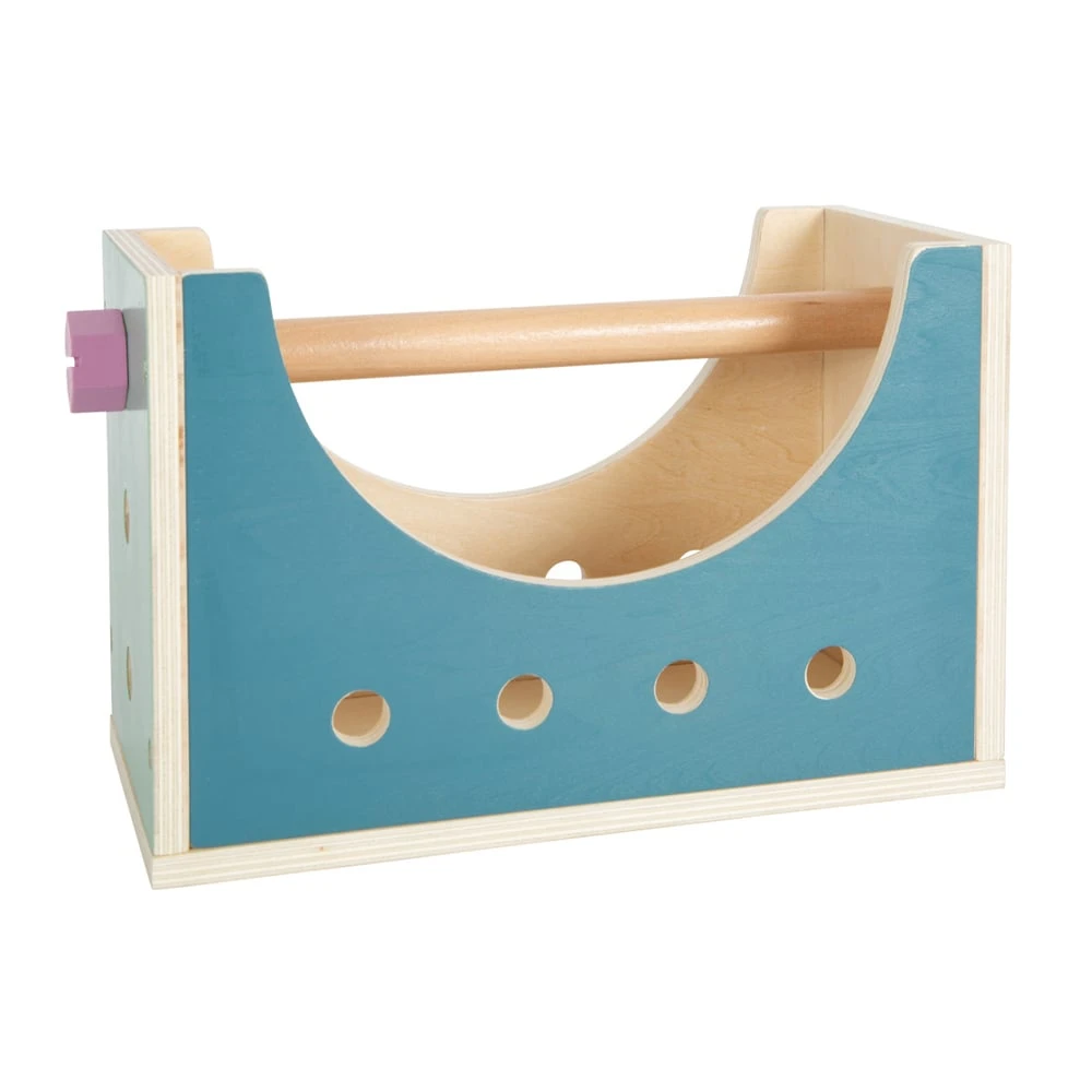 С тази здрава дървена кутия за инструменти младите майстори-строители винаги ще имат подръка професионалните си инструменти! Когато се обърне, кутията с инструменти може да бъде използвана като мини работна маса! Фактът, че дръжката и аксесоарите могат да се монтират върху кутията по желание, позволява много пространство и допълнителни забавления по време на игра. Продуктът се предлага със скоба.
