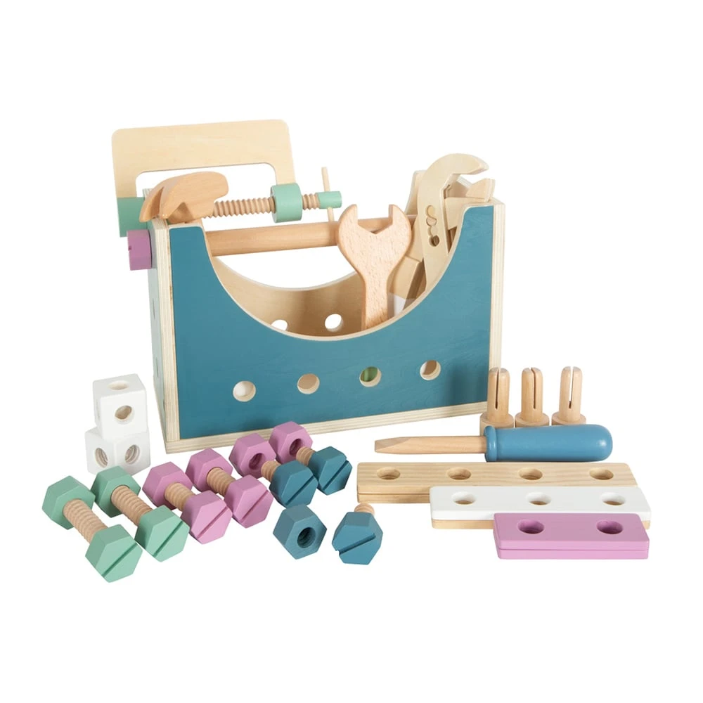 Тази кутия с инструменти за деца разполага с изчистени, скандинавски, неутрални по отношение на пола пастелни цветове, които насърчават активната ролева игра, като същевременно тренират фините двигателни умения.