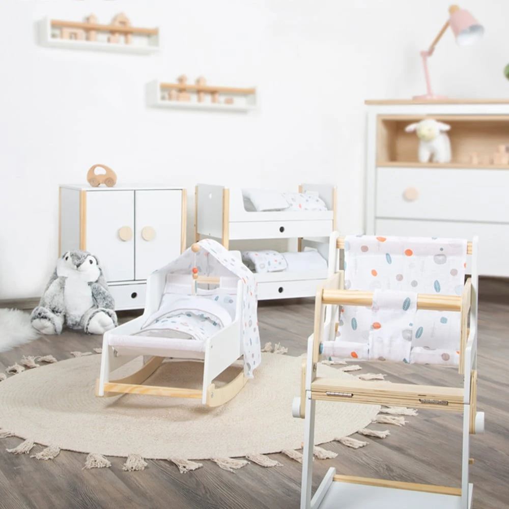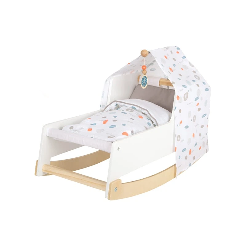 Куклите също имат нужда от сън! Тази модерна люлка прави впечатление с изчистения си скандинавски дизайн, изтънчена форма и функционалност. Спалното бельо в неутрални цветове и огромното одеяло позволяват на куклите и плюшените играчки да „спят“ спокойно под балдахина. Плъзгачите и сенникът се свалят, което позволява на люлката да се трансформира в стилен шезлонг! Предлага се със сваляща се повърхност за легло, изработена от разтегателен плат.
