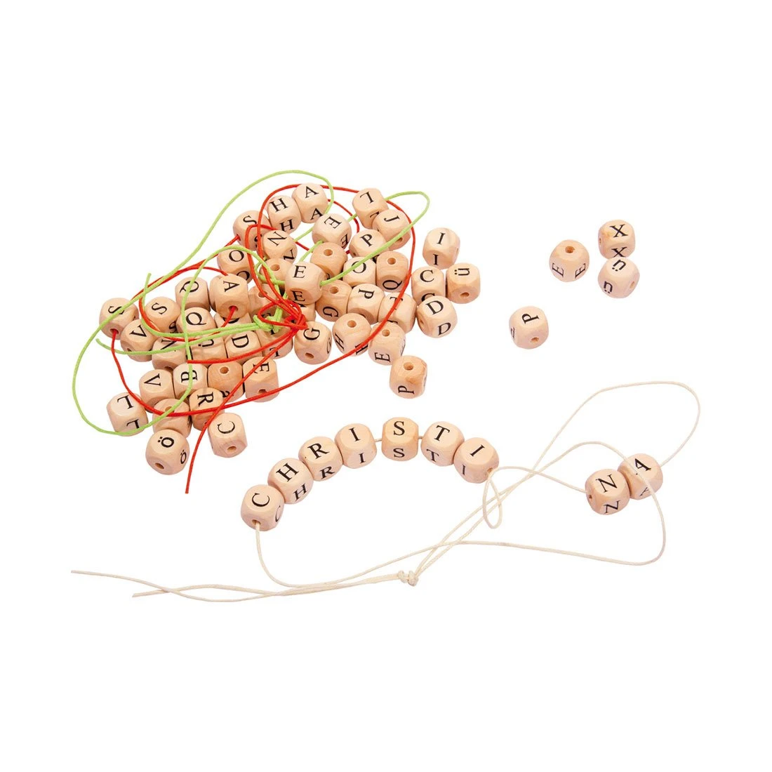 Дървените зарчета с букви могат лесно да се нанизват върху включените четири цветни въженца, така че можете бързо да образувате страхотни вериги с имена и други комбинации от думи.