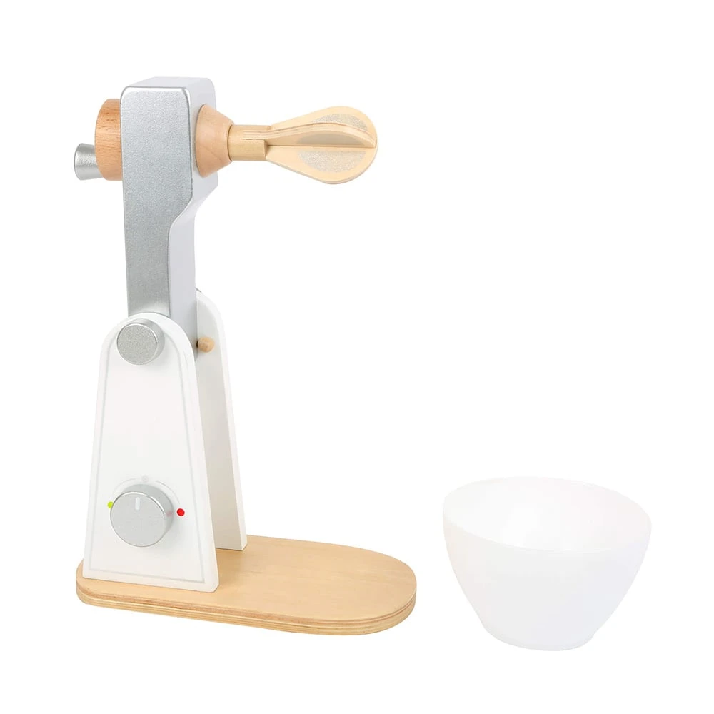 Децата се превръщат в истински кулинари, докато играят в своите кухни. С детския дървен миксер ще разбърквате тестото в пластмасовата купа. Въртящата се глава може да се придвижва нагоре, което позволява купата да бъде извадена лесно. Бутонът за включване и изключване може да се превключва, точно както при истински миксер. Миксерът разполага със стабилна основа.