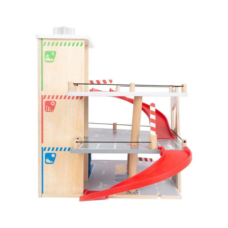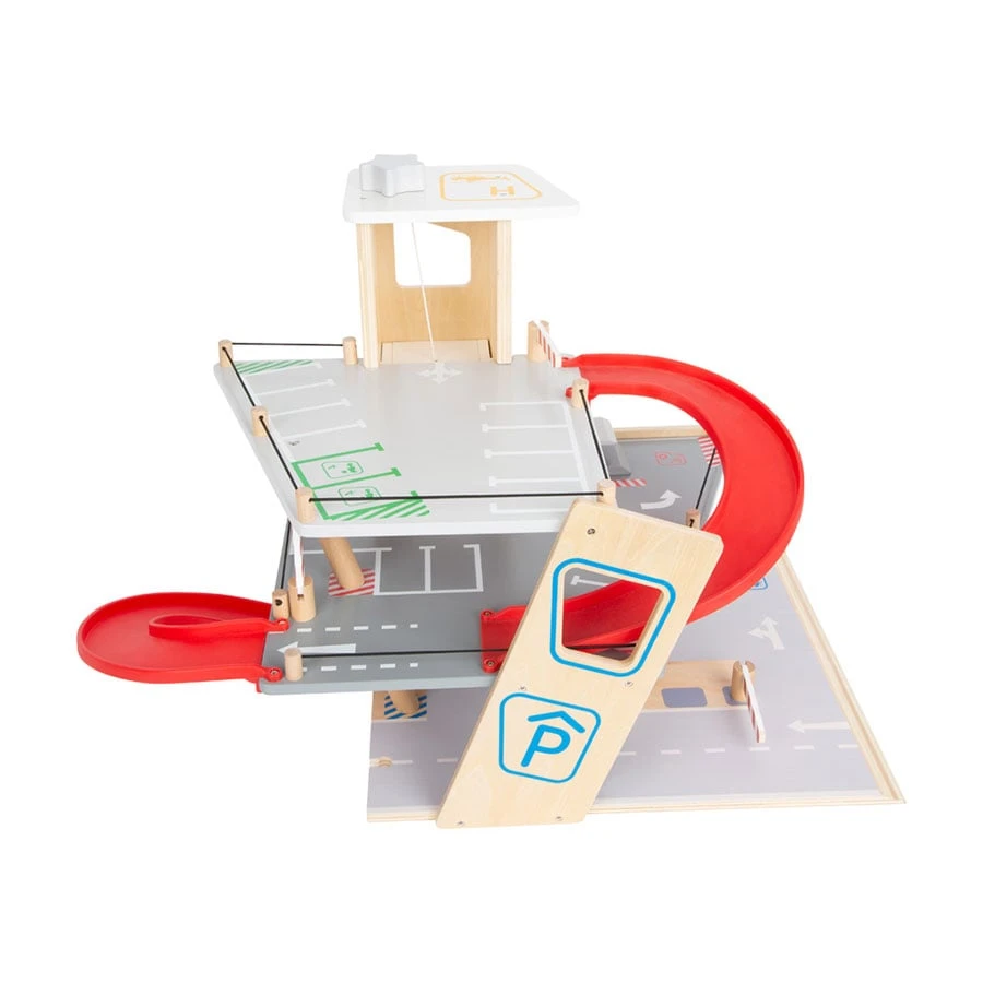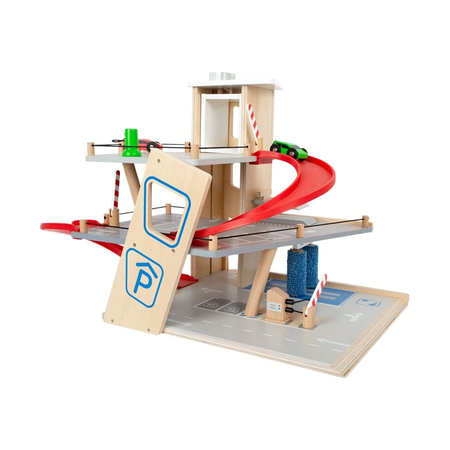 Дървен паркинг за коли с две включени играчки, които могат да бъдат паркирани на три различни нива.