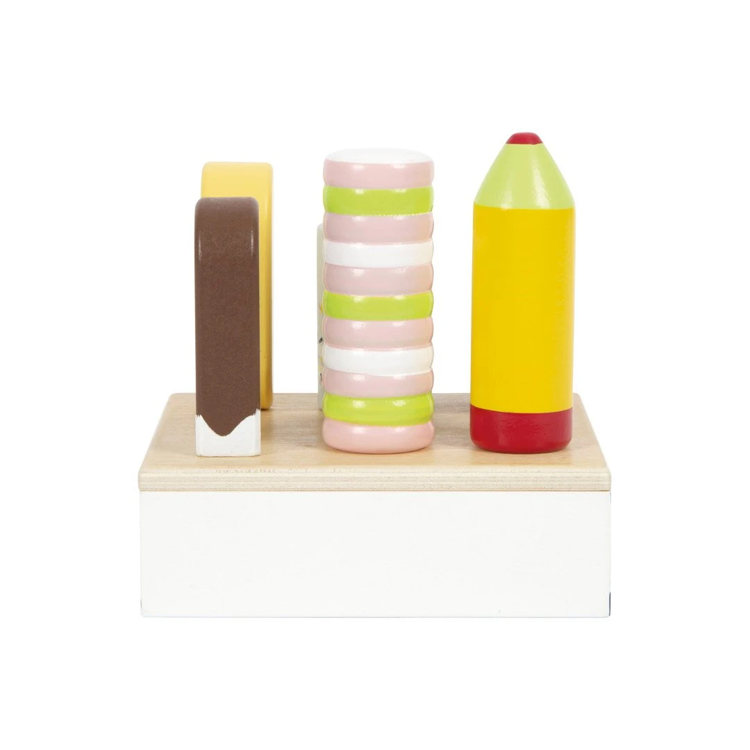 Децата могат да „купят“ тези дървени сладоледени близалки и след това да ги „сервират“ по време на игра на пикник, в рамките на въображаема ролева игра.