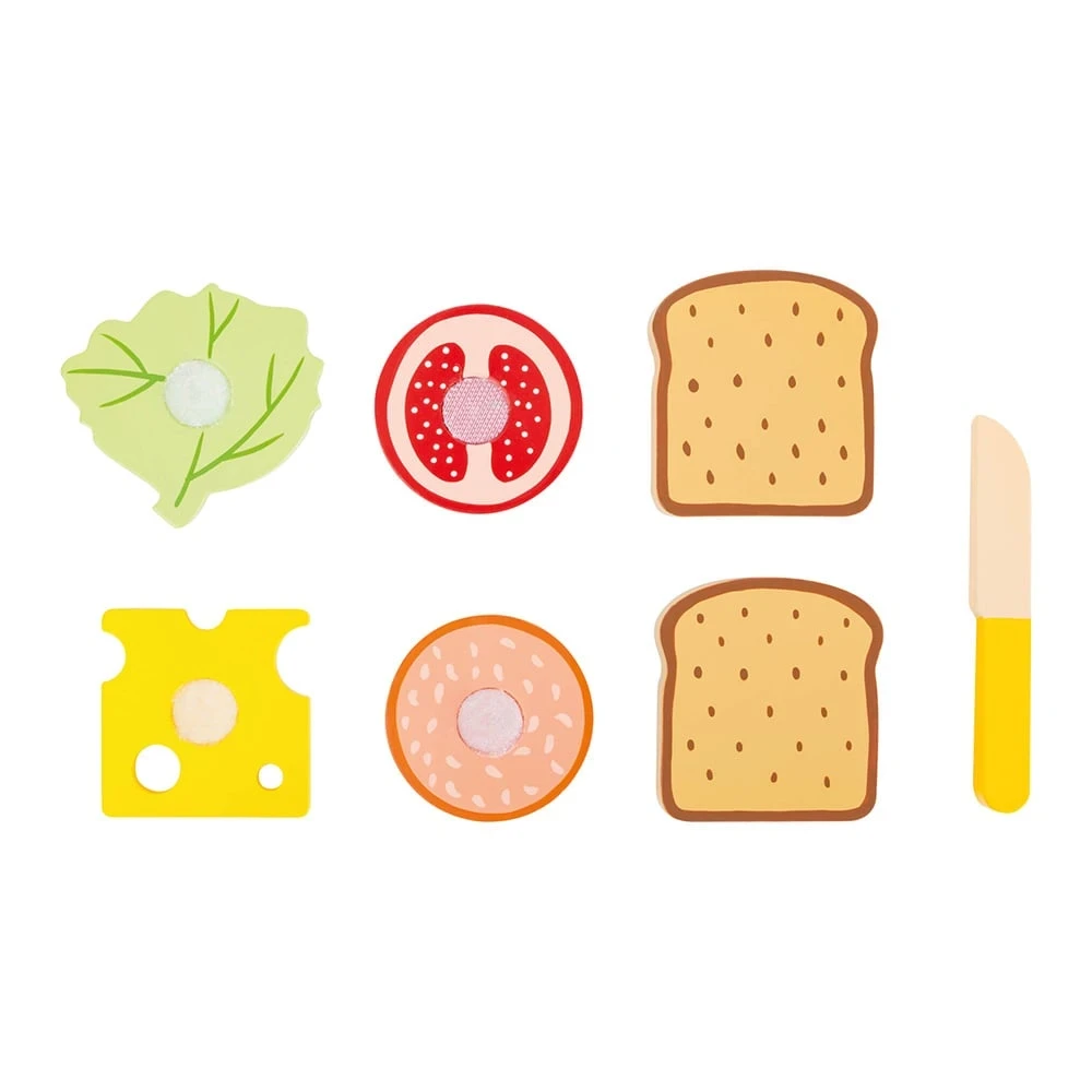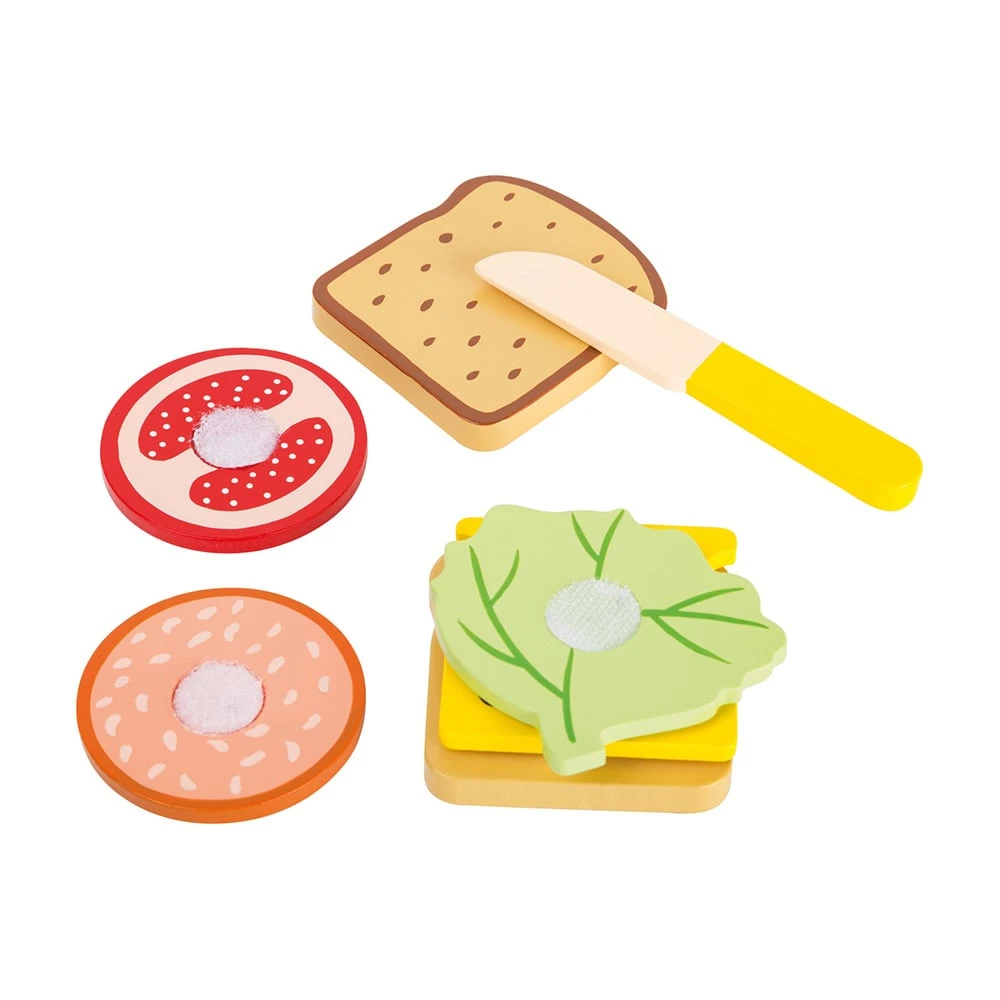 Частите на сандвича са изработени от 100% сертифицирана дървесина FSC®. Залепват се чрез велкро и могат да бъдат отделени с дървения нож. Комплектът е идеалното допълнение към детската кухня. Научете детето си по интересен начин да приготвя закуската си. И така, кой е гладен?