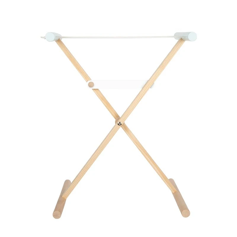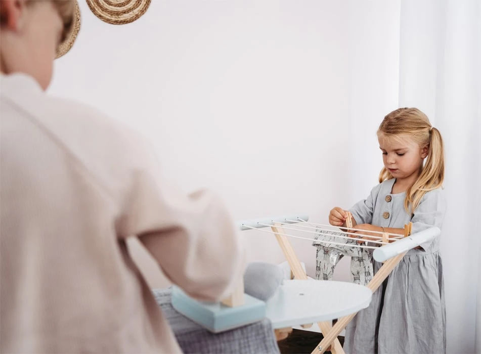 Реалистичен дървен сушилник за дрехи с памучни въженца за ролеви игри на „пране“. Лек и сгъваем, той се прибира плоско след игра и е лесен за сглобяване от децата.