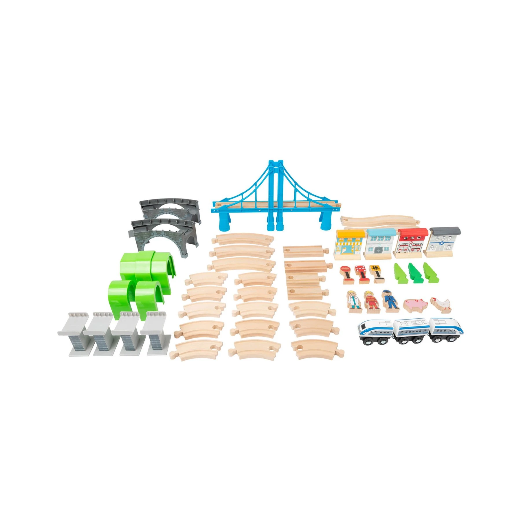 Очаква ви пътешествие из големия, широк свят на влакчетата! С дървения комплект в XL формат децата могат да се потопят в спиращ дъха миниатюрен свят. Тук експресният влак кара над висящ мост и преминава през два тунела. Страхотна играчка, коят ще превърне детската стая в свят на влакчета и машинисти.