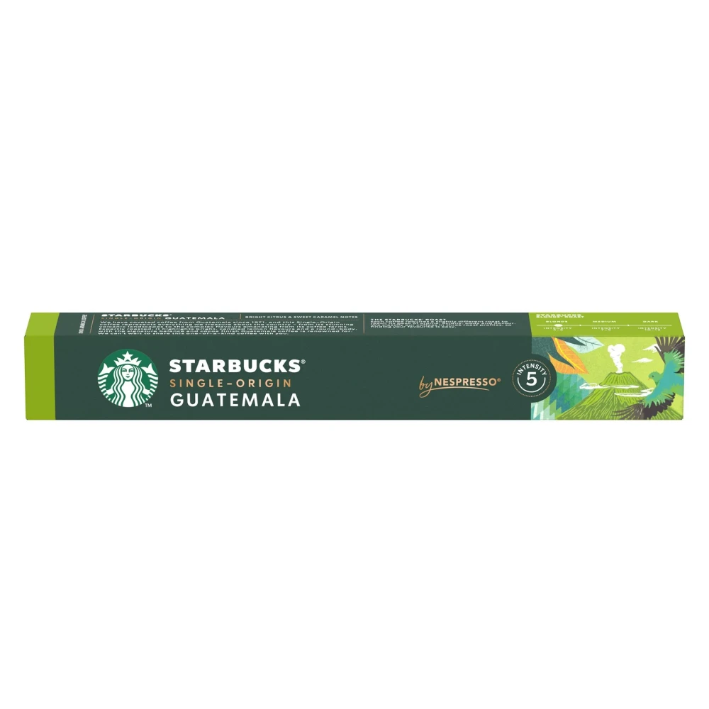 Наслади се на STARBUCKS® Single-Origin Guatemala от Nespresso® – кутия с 10 броя кафе капсули, приготвени от същите кафе зърна 100% Арабика, използвани в кафетериите STARBUCKS®. Със свеж отчетлив вкус, ароматни лимонови нотки и интензитет 5, това светло изпечено кафе е прекрасен избор за твоите STARBUCKS® кафе рецепти.