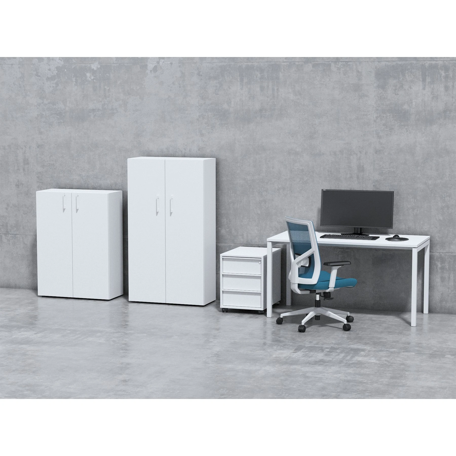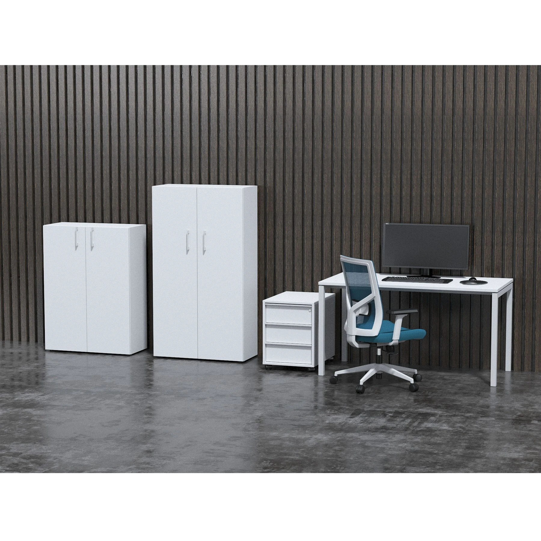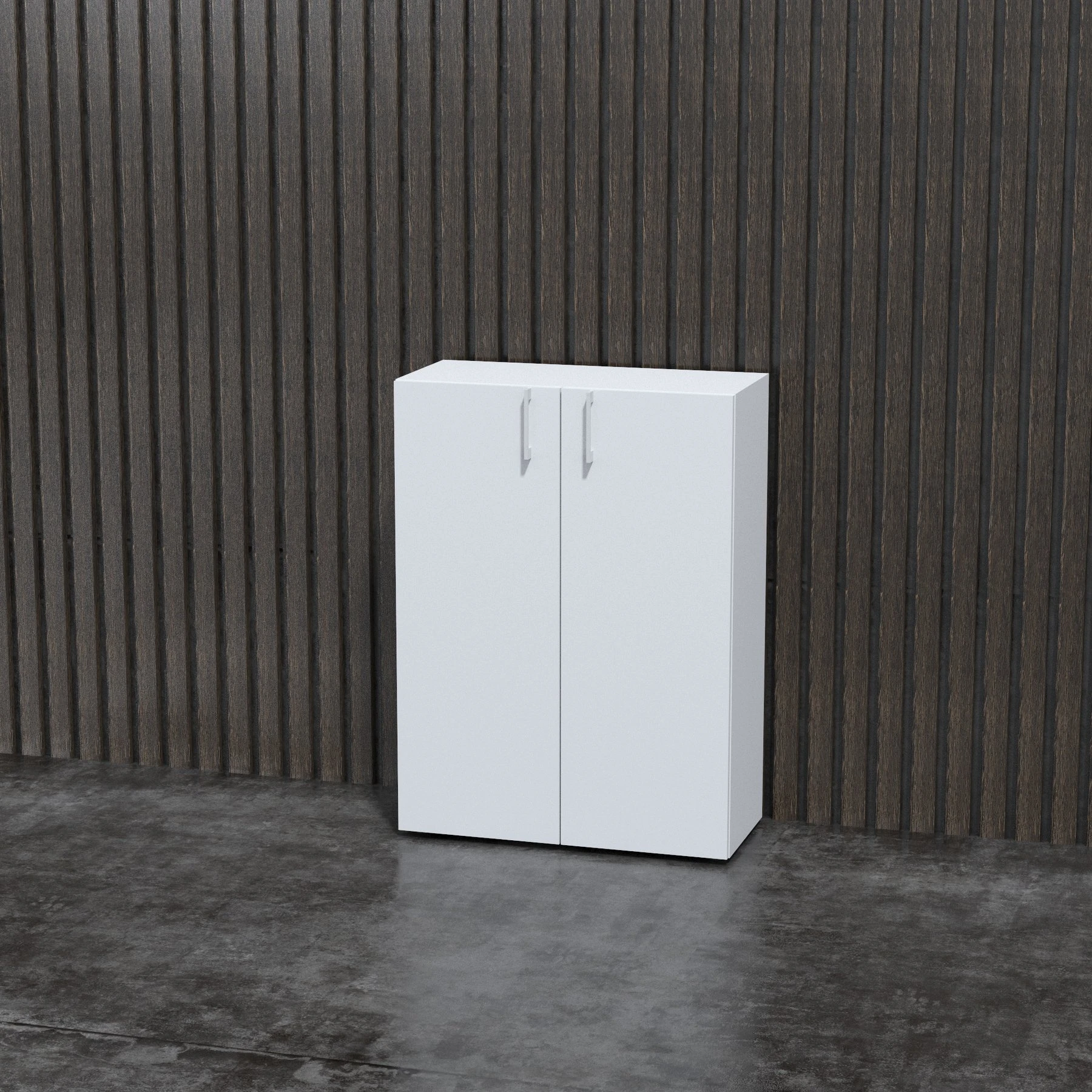 Стелажът разполага с две врати и три рафта за по-добра организация. Включва меламинов корпус с врати и рафтове по 18 mm, с 1 mm кант, както и 16 mm меламинов гръб. Има възможност за заключване.