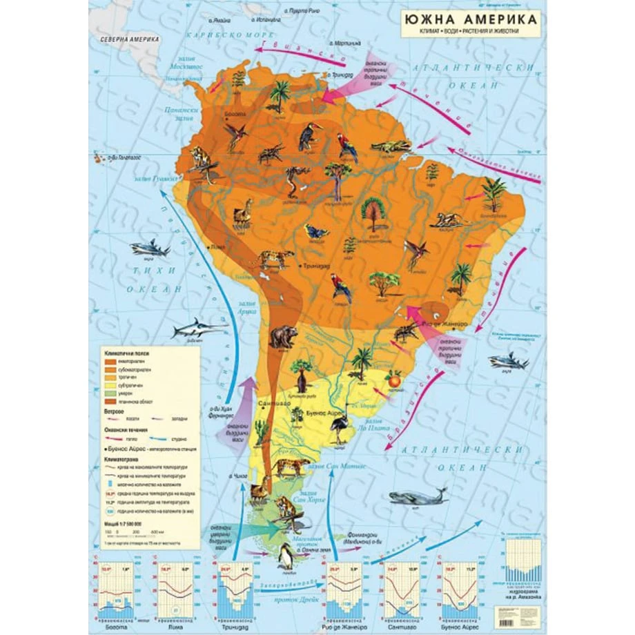 Стенна карта на Южна Америка, климатична, 100 x 140 cm, ламинирана