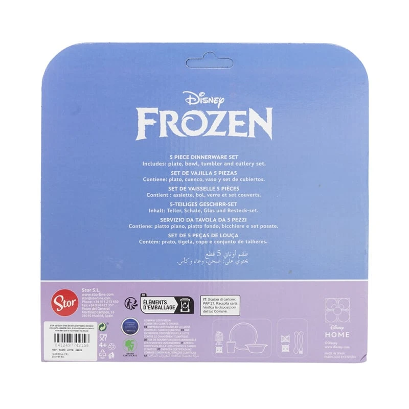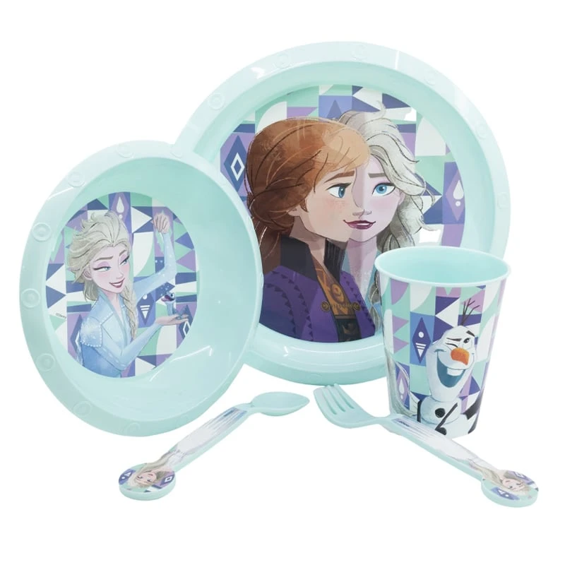 Детски сервиз за хранене за обяд или вечеря „Замръзналото кралство“, състоящ се от чаша, купа, чиния и прибори.
