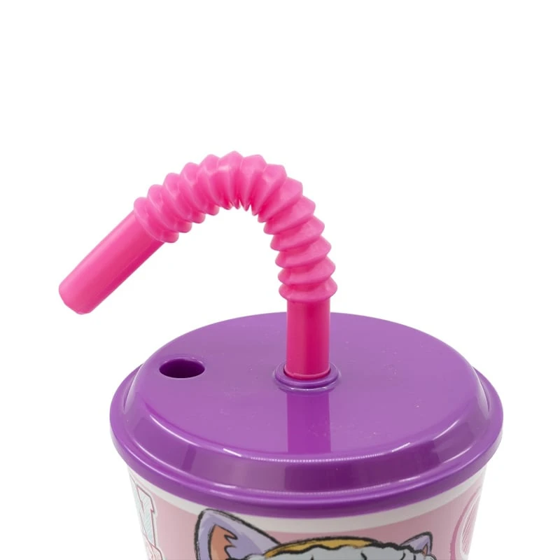 Дизайнът включва гъвкав капак и сламка за лесно и безопасно пиене.