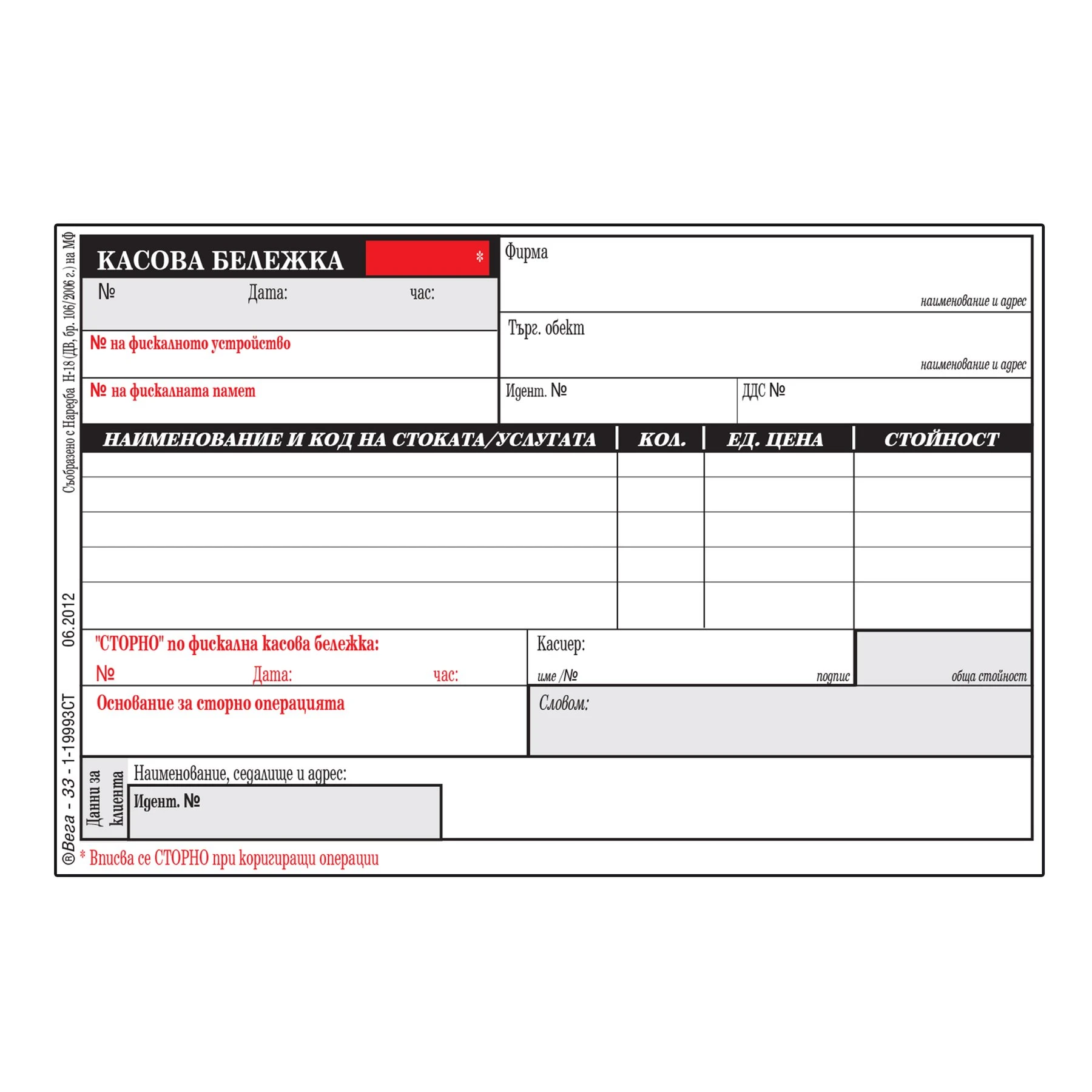 Сторно касова бележка, химизирана, 9.7 х 14.5 cm, 100 листа