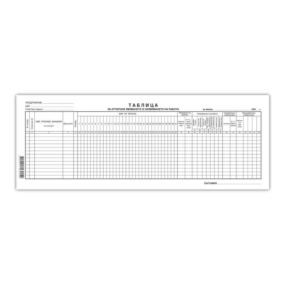 Таблица за отчитане явяването на работа, малък формат, 50 листа