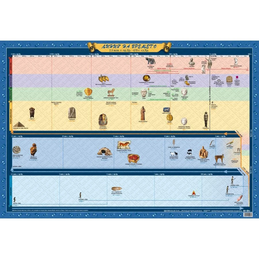Учебно табло ''Линия на времето''. Летоброенето започва от 2.5 млн. г. пр.н.е. до 476 г. сл.н.е. Подходящо е за часовете по история.