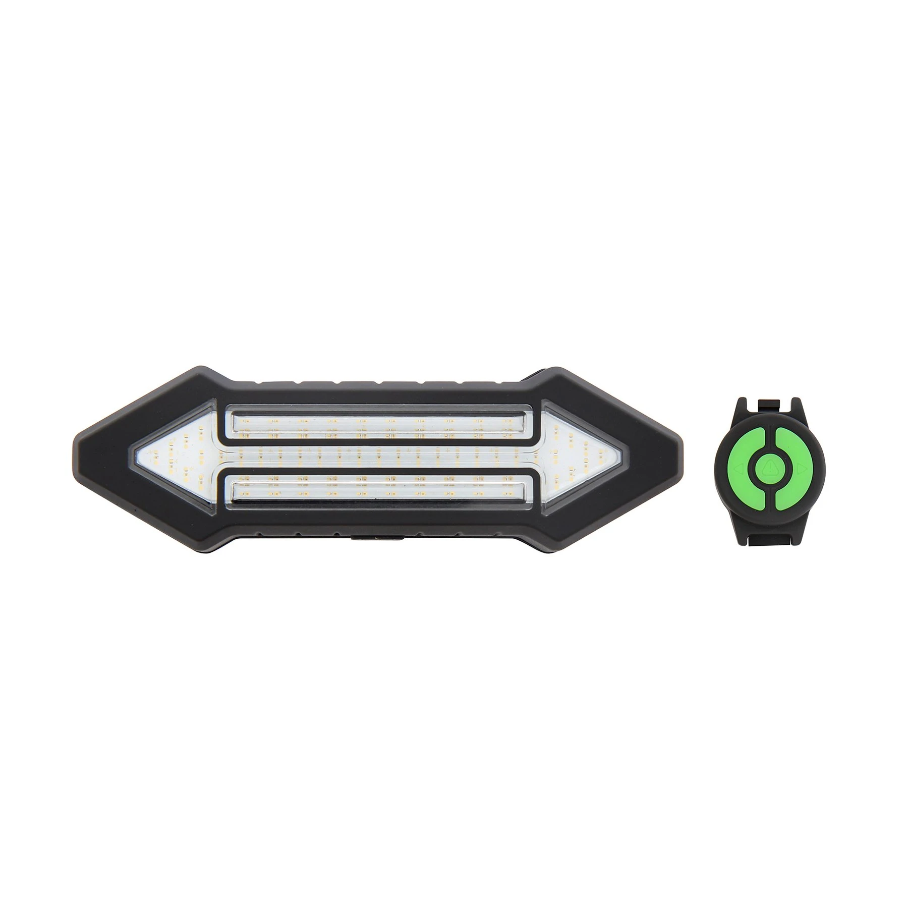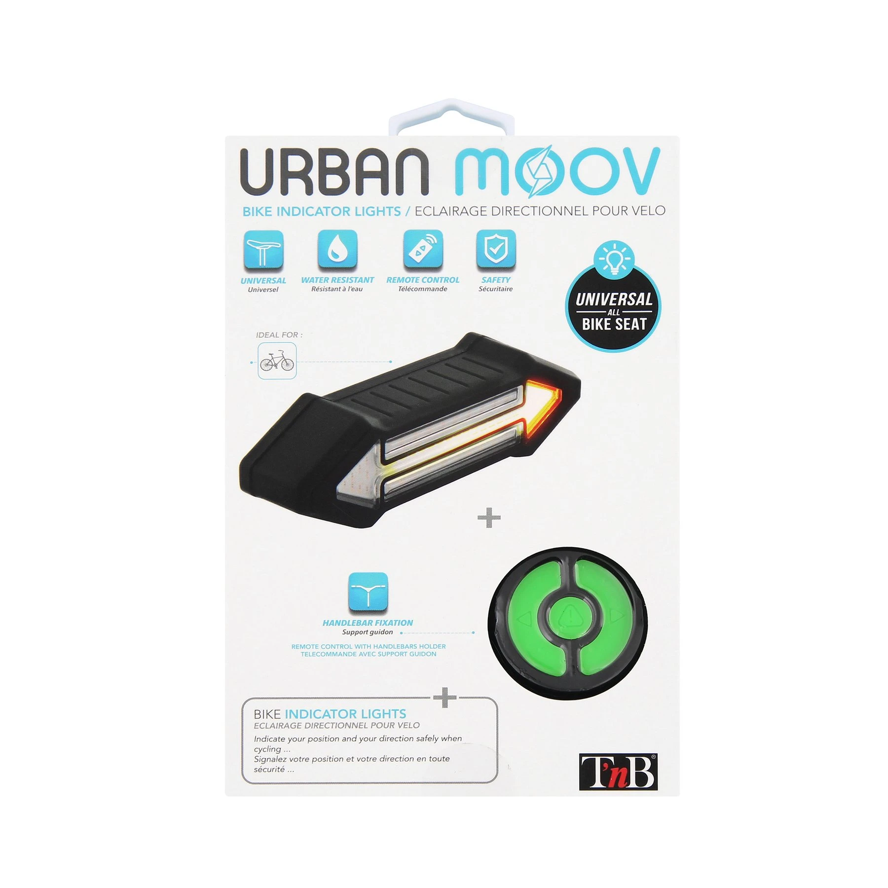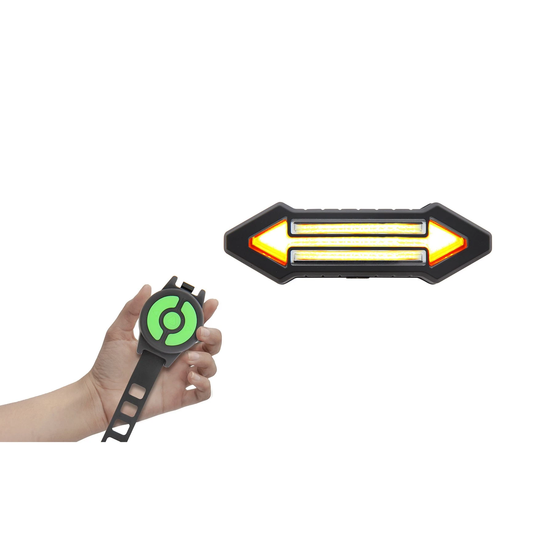 Мигачи за колело с фиксираща система за поставяне под седалката. Този продукт предлага 3 режима: стрелка за ляв завой; стрелка за десен завой и SOS (CENTRAL RED LED BAR), за да сигнализирате, че имате проблем. Има дистанционно управление, което се поставя на кормилото на велосипеда. То осигурява безопасен контрол на светлинния сигнал, докато карате колелото си.