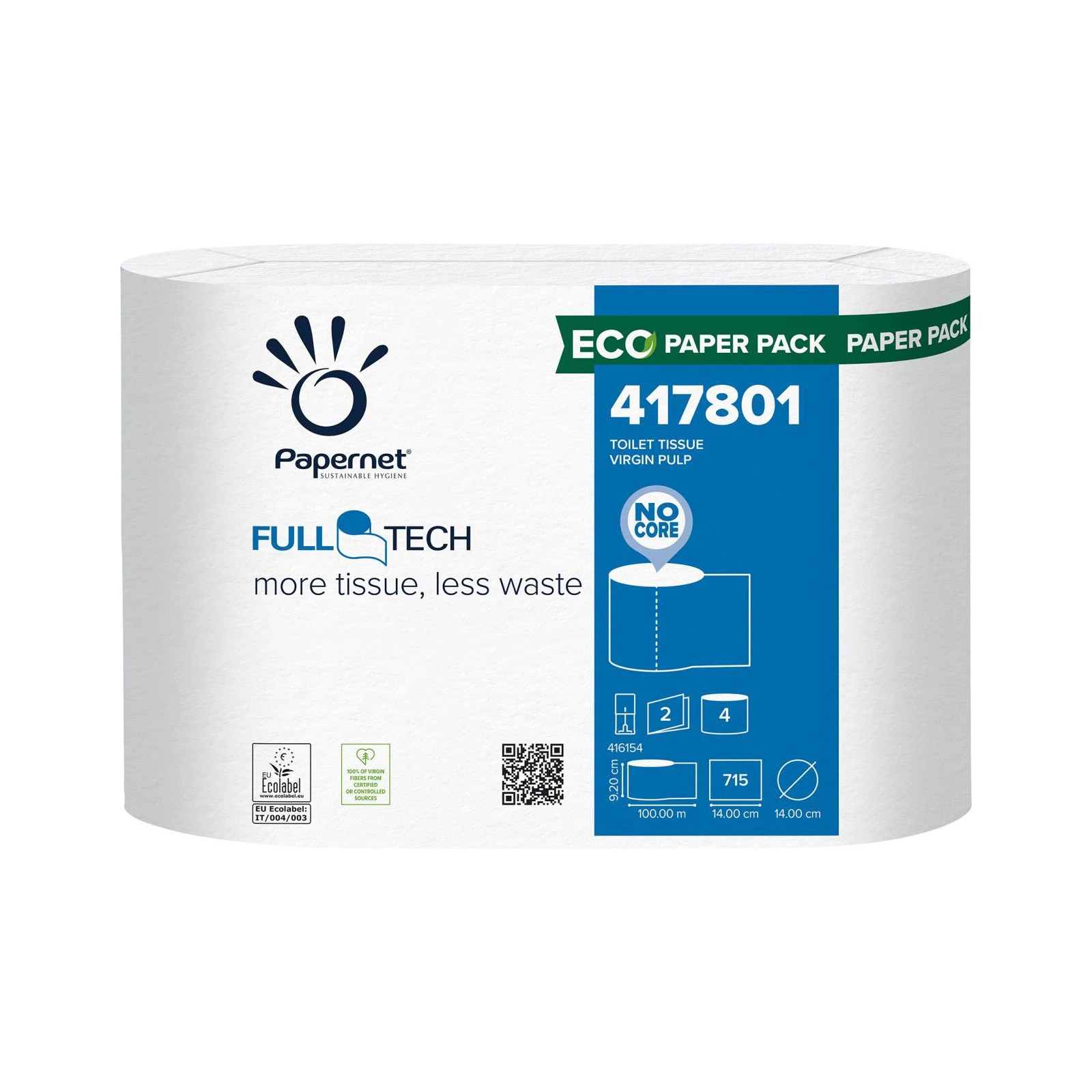 Тоалетна хартия Papernet, Full Tech, целулоза, двупластова, 715 къса, 4 броя, 100.1 m
