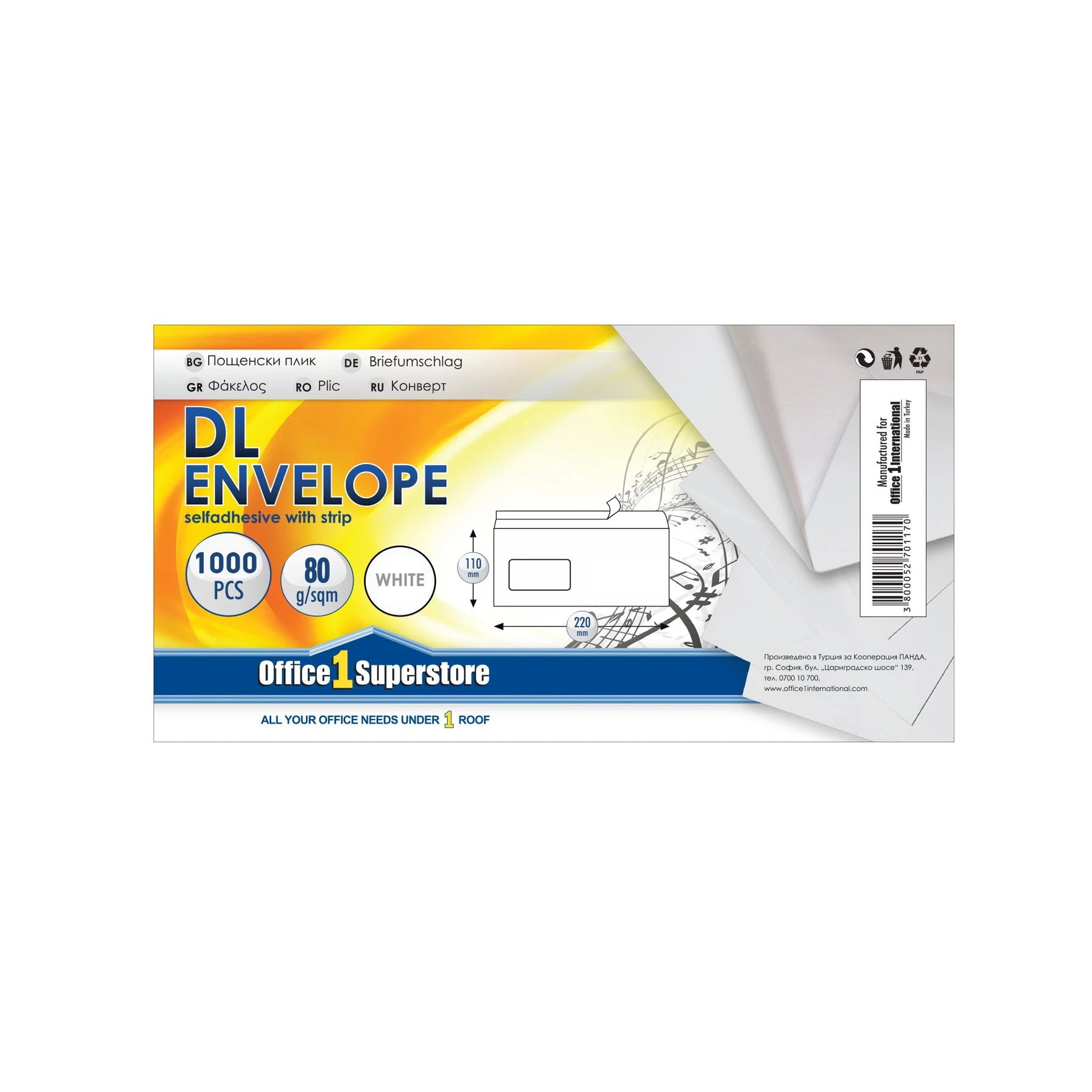 Top Office Плик, DL, 110 x 220 mm, хартиен, с ляво прозорче, със самозалепваща лента, бял, 1000 броя