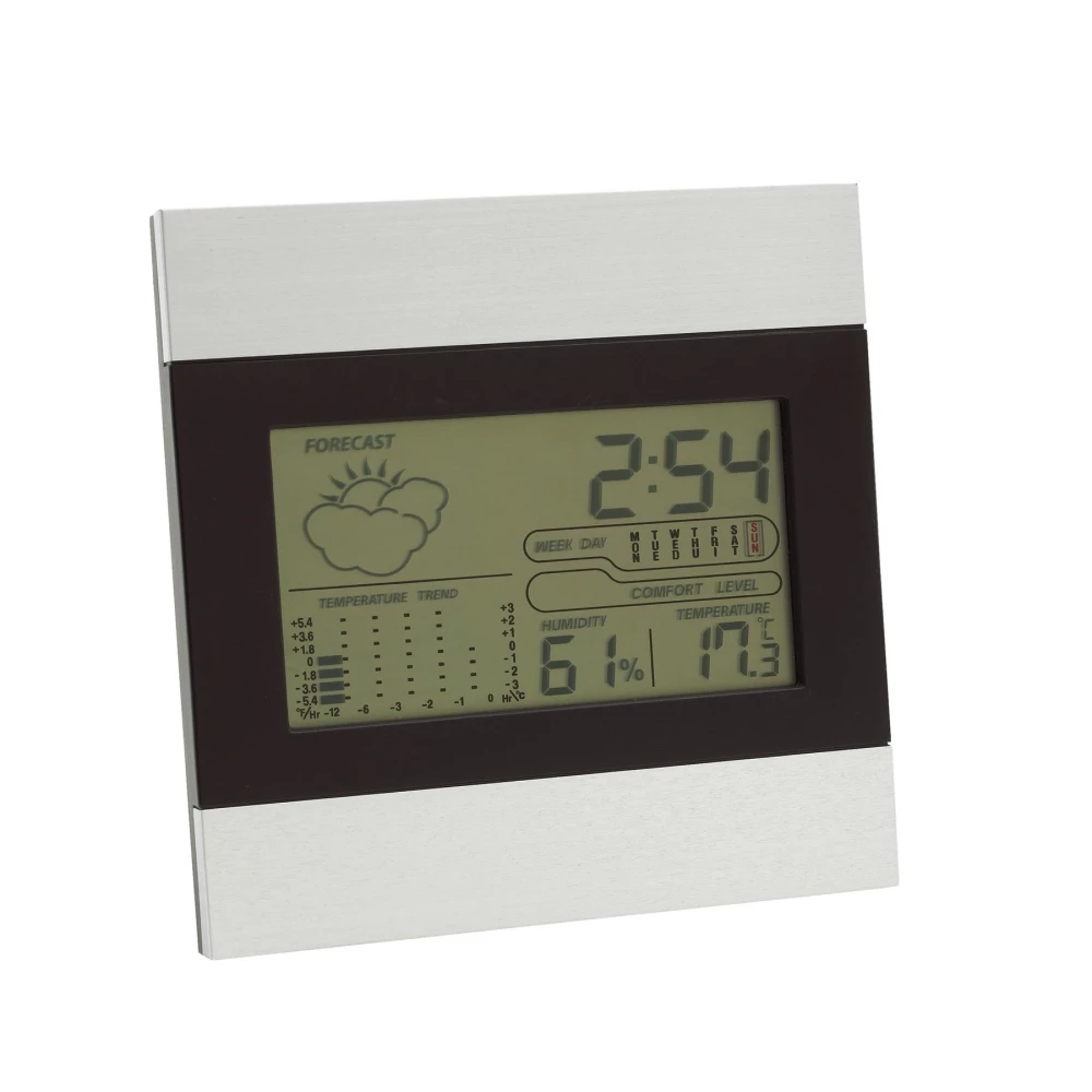 Метеорологична станция Shiny Day. Включва LCD екран, алуминиев корпус, будилник, дата, термометър и разгъваема поставка.